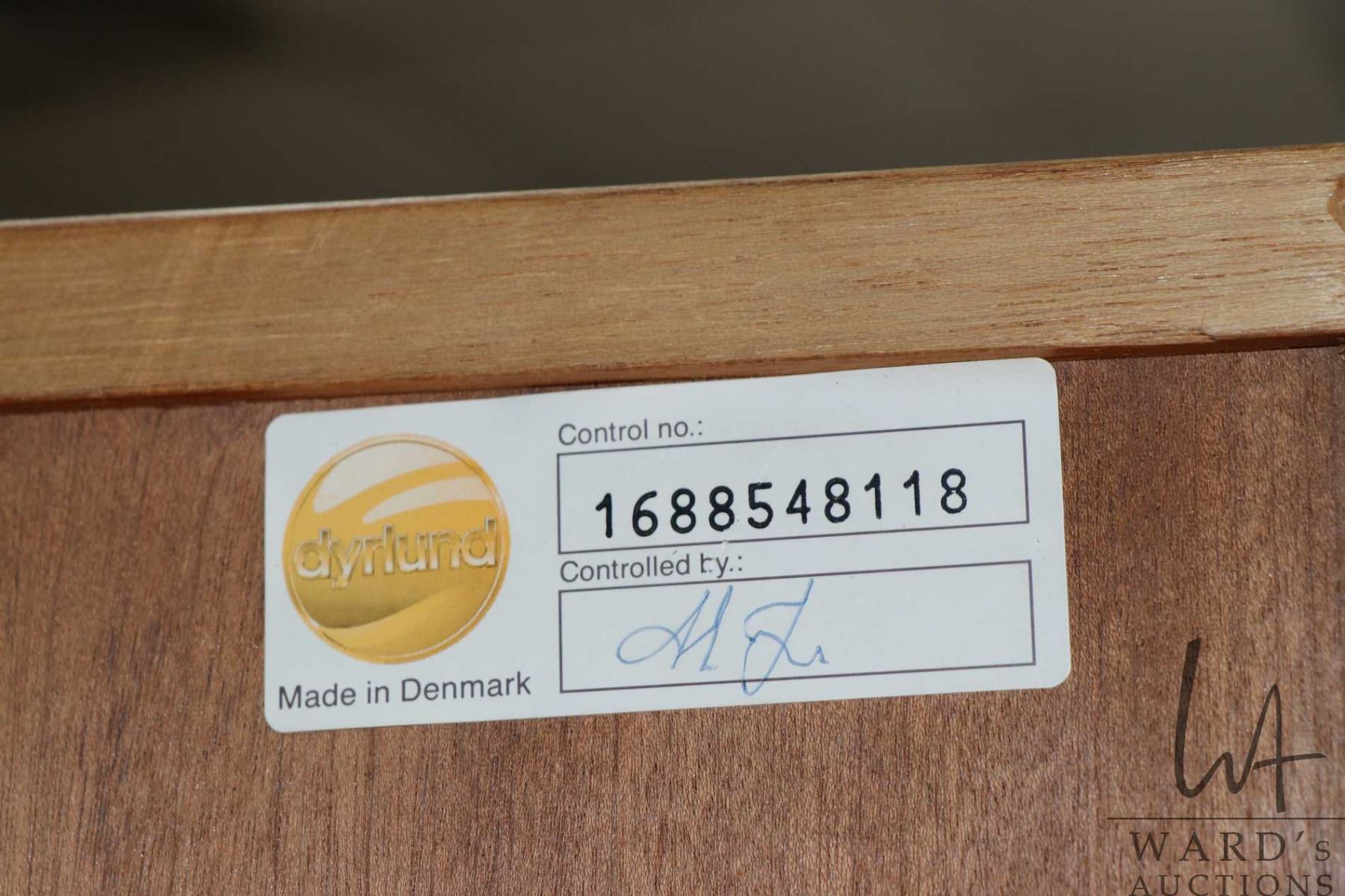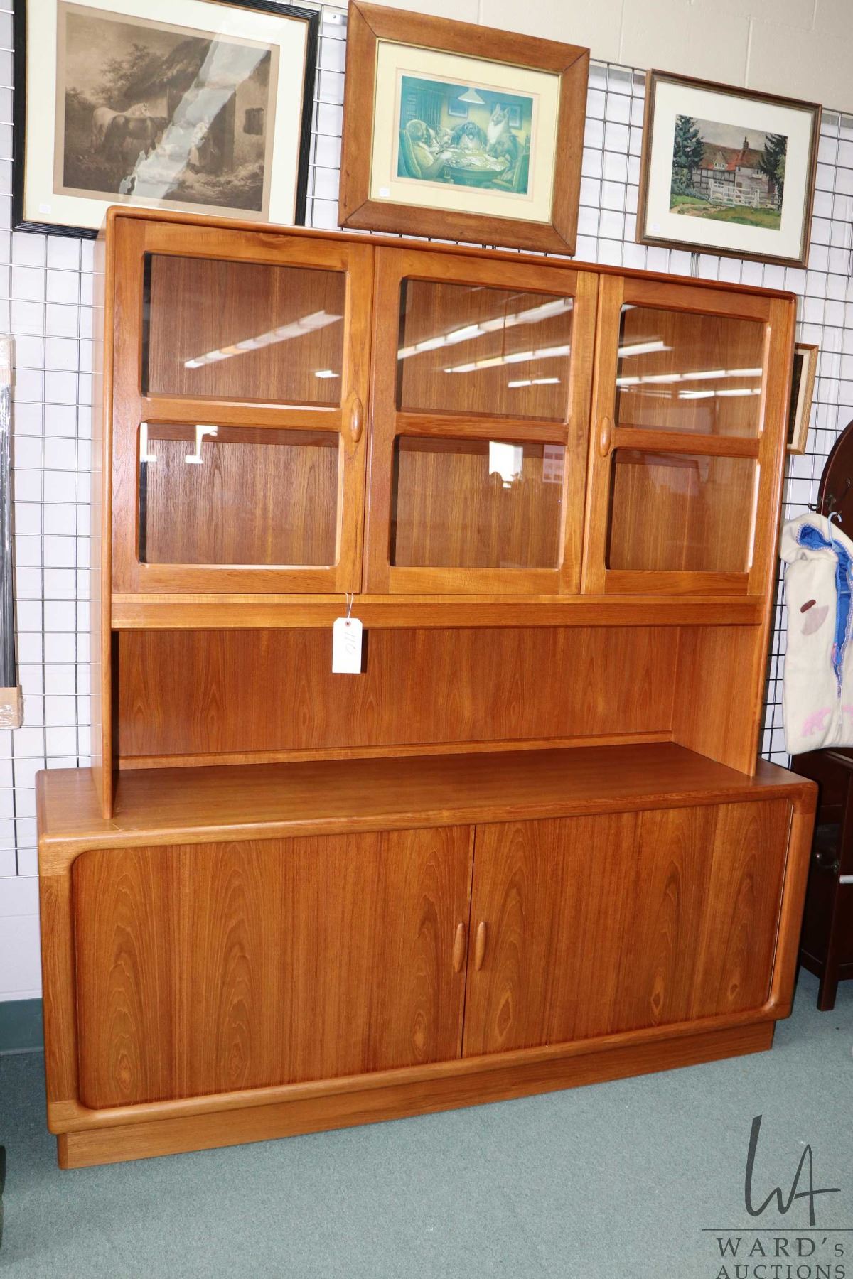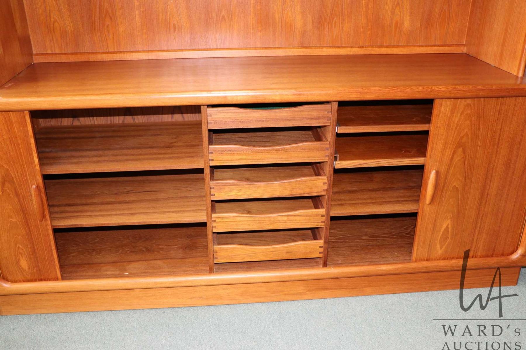 Danish made chest on chest teak cabinet with two large rolling doors exposing multiple drawers and shelves and illuminated display hutch made by Dyrlund, 78" in height and 75" wide