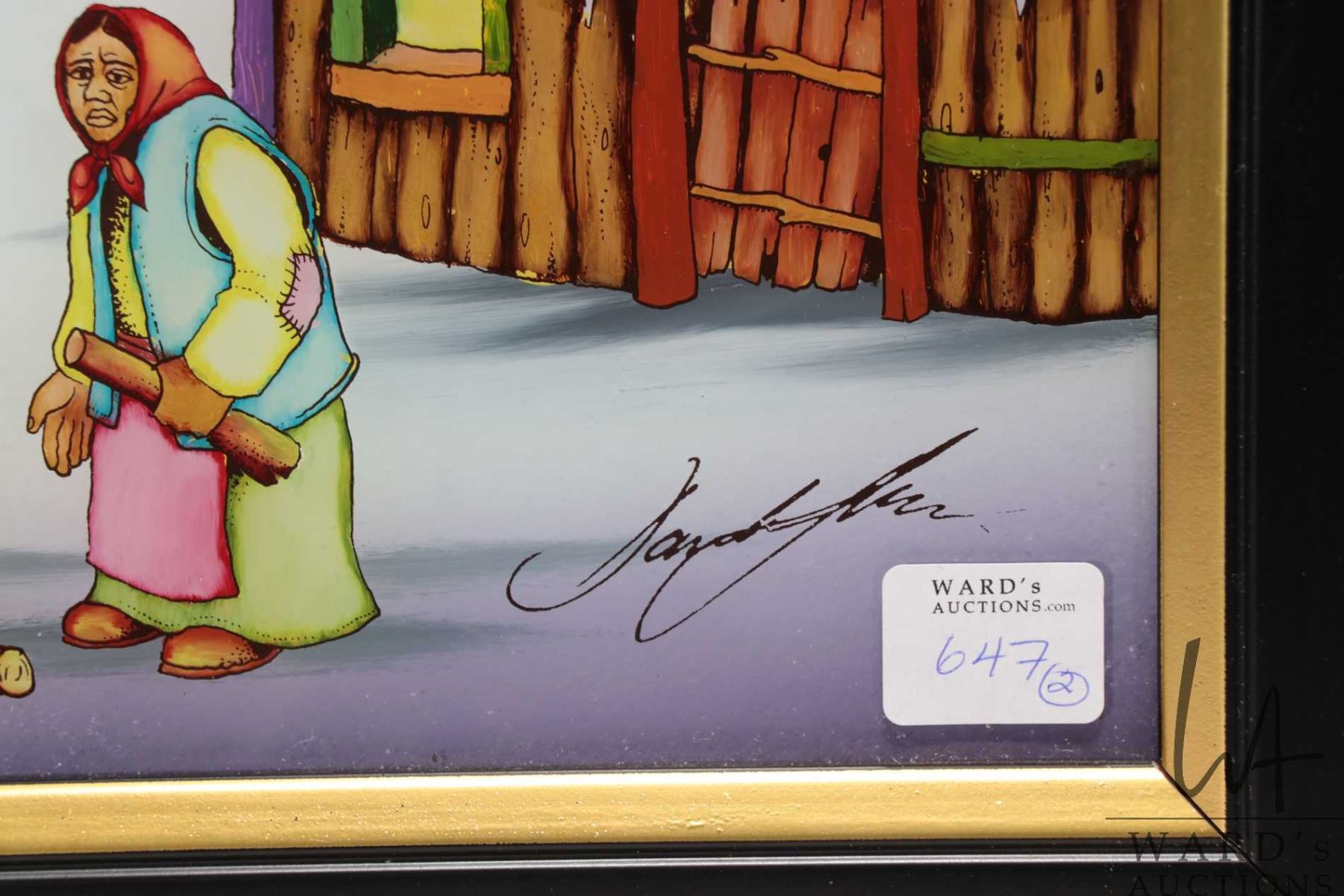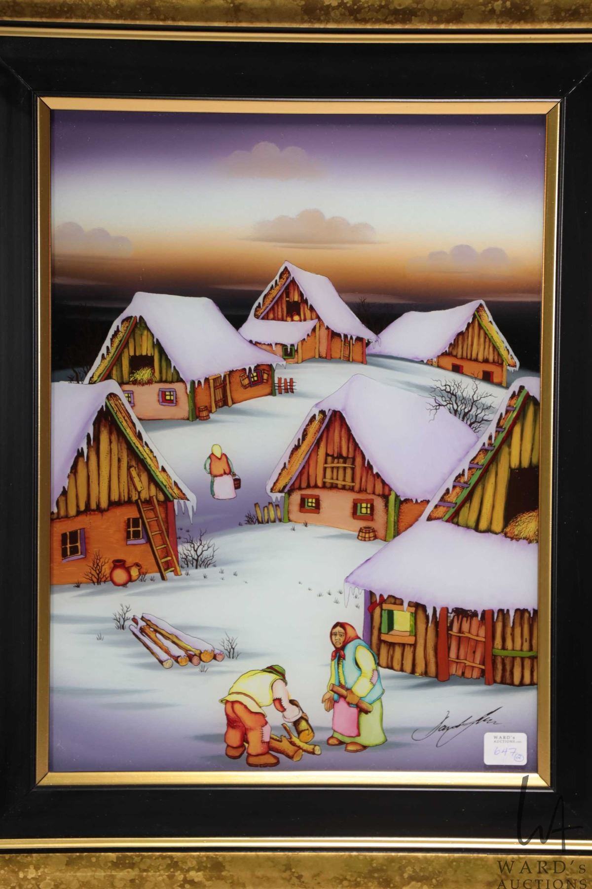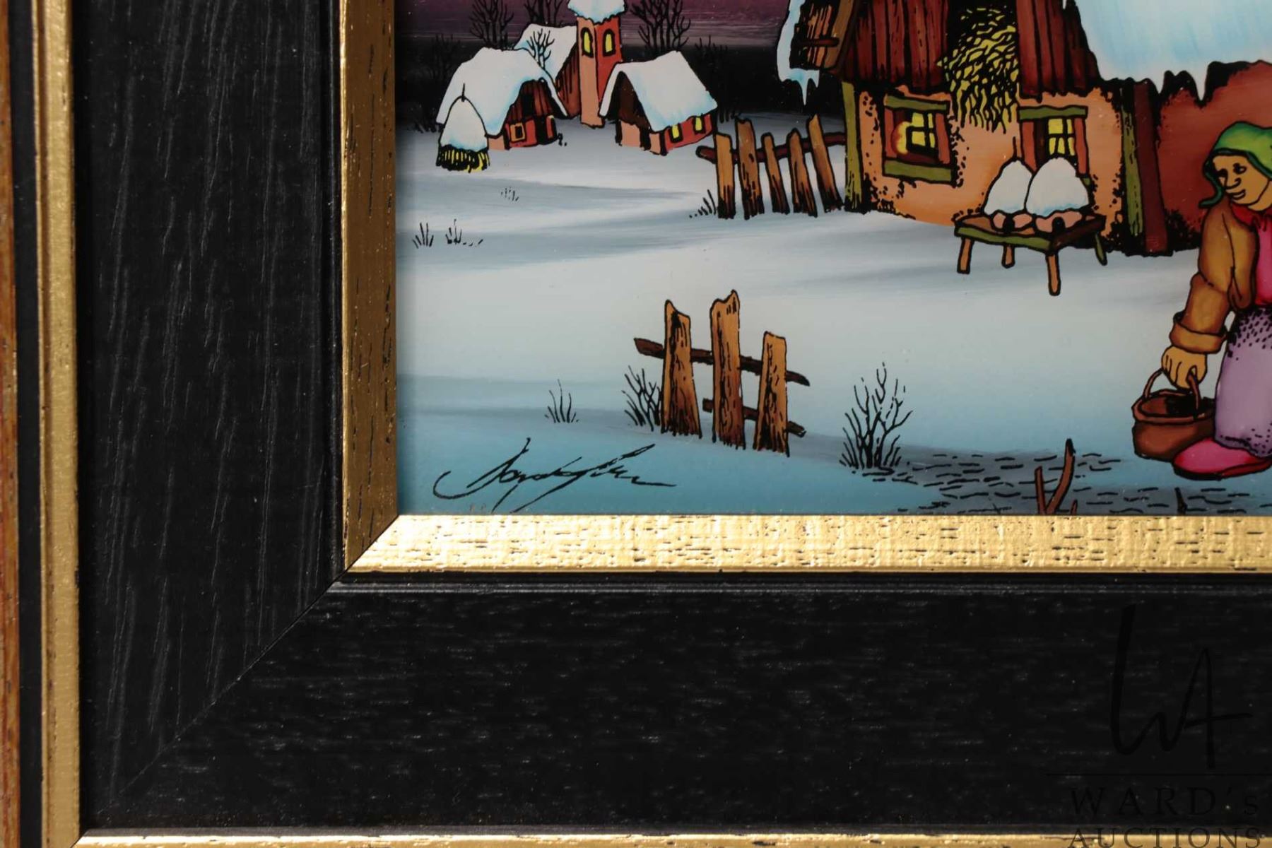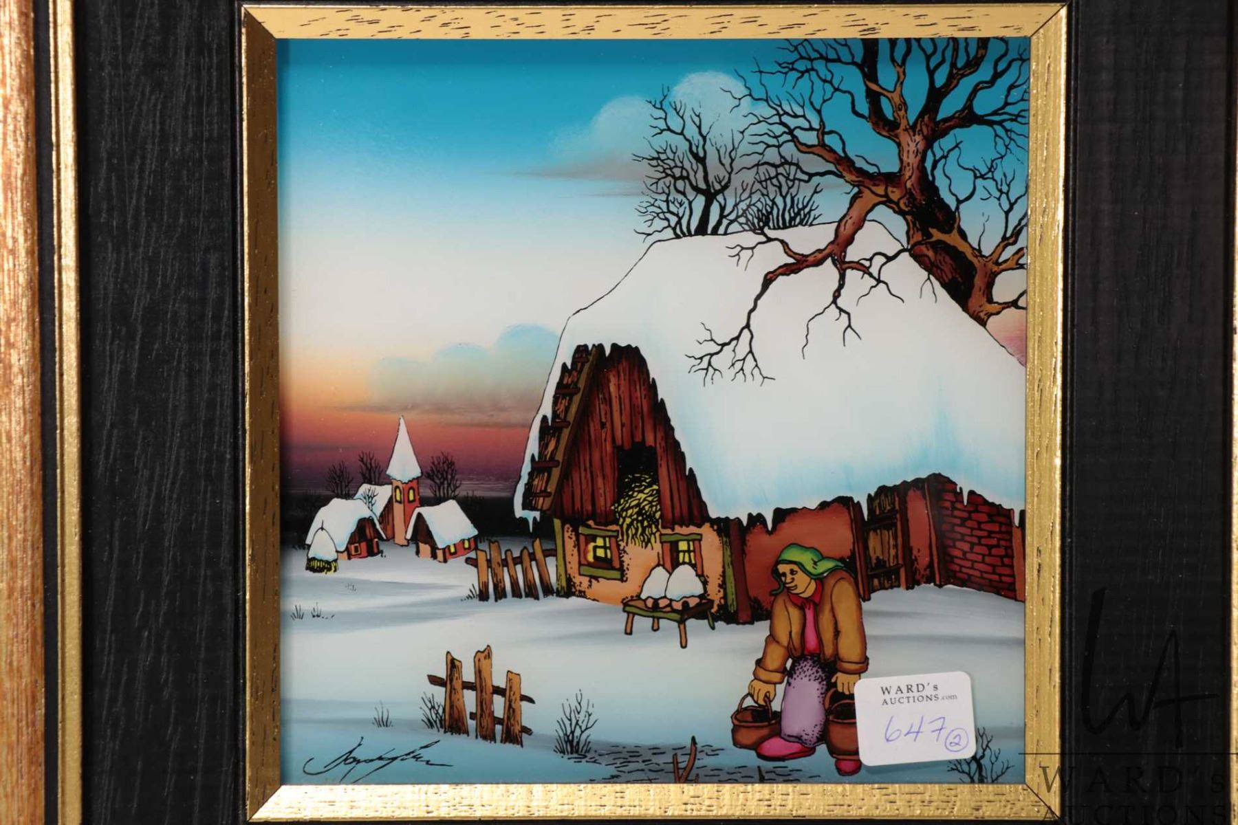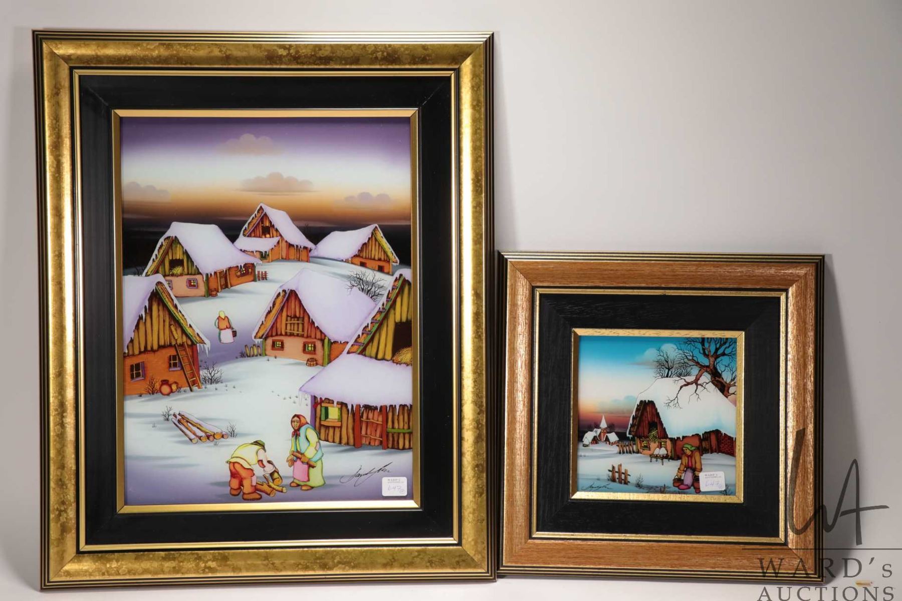 Davidovic Mile, two framed glass paintings of village winter scenes including 7" X 7" and a 12" X 16