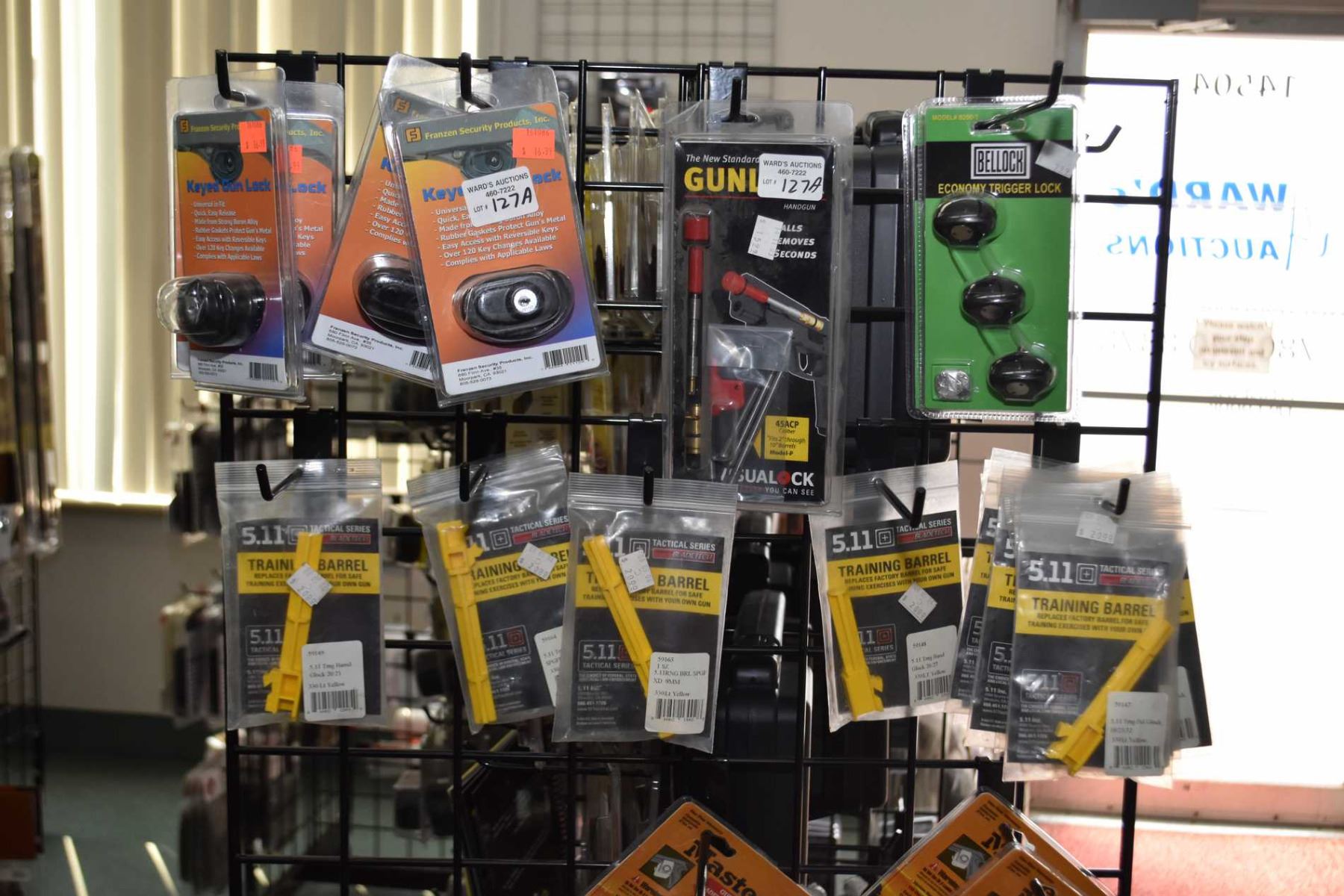 Dealer lot of new retail accessories Dealer lot of assorted new retail accessories including trigger locks, alarm locks, 511 Tactical training barrels, Mossberg pistol grips, recoil pads etc.
