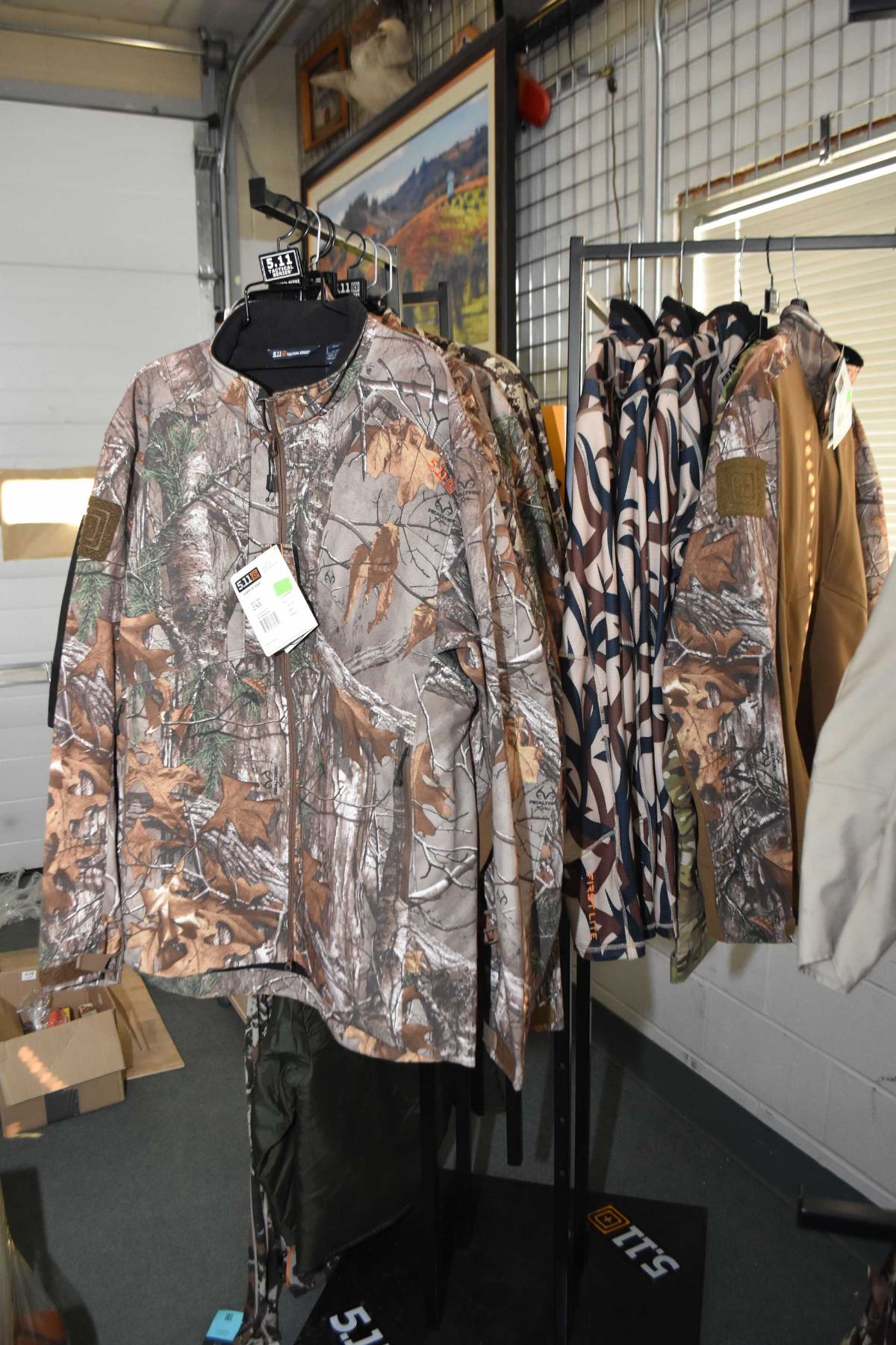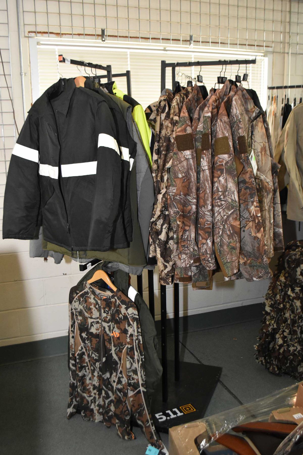 Dealer's lot of jackets Dealer's lot of approximately 20 brand new jackets, assorted styles and sized, including 511 Tactical, First Lite etc. assorted styles and sized, must be verified in person, includes rack if desires