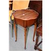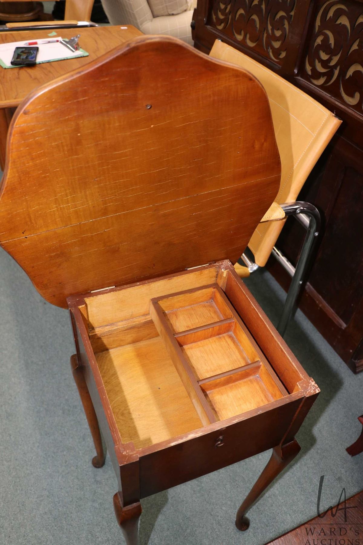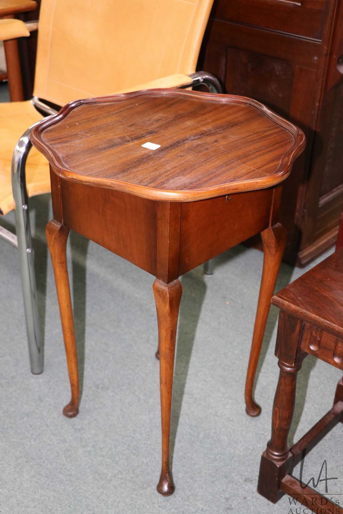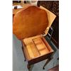 Delicate antique sewing table on tall cabriole supports, 25" H X 17" diameter