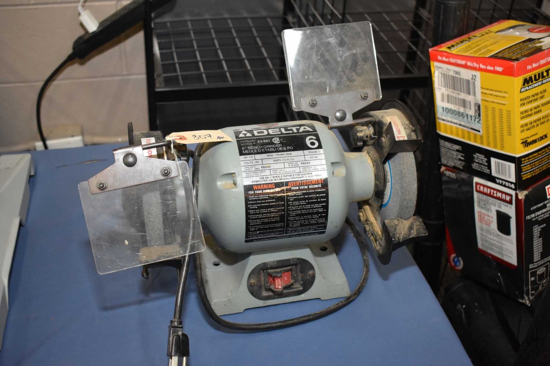 Delta model 23-681 quarter horse power 6" bench grinder, tested and working. Note: This lot cannot b