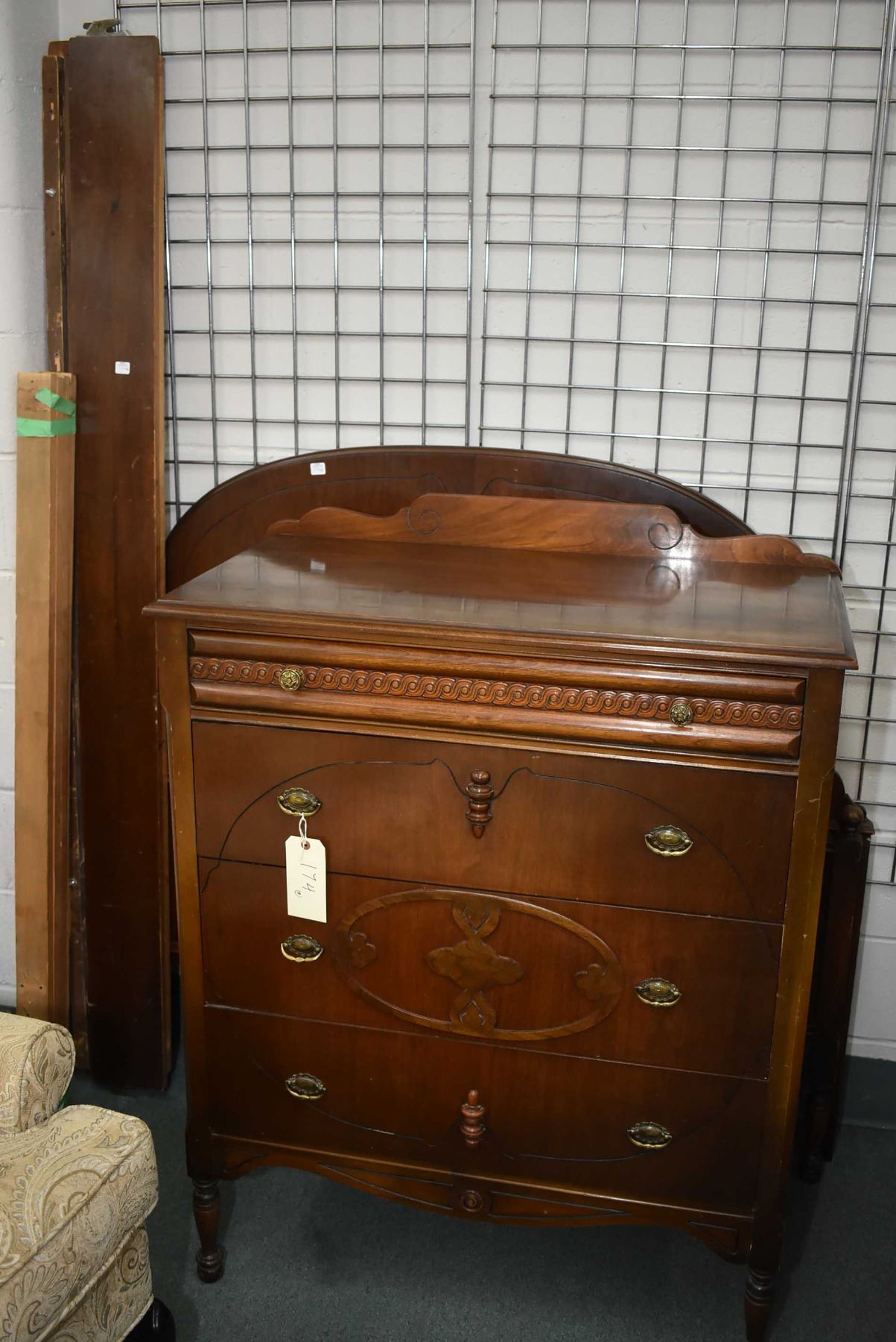 Depression era four drawer walnut highboy and matching double sized head board, foot board with rails
