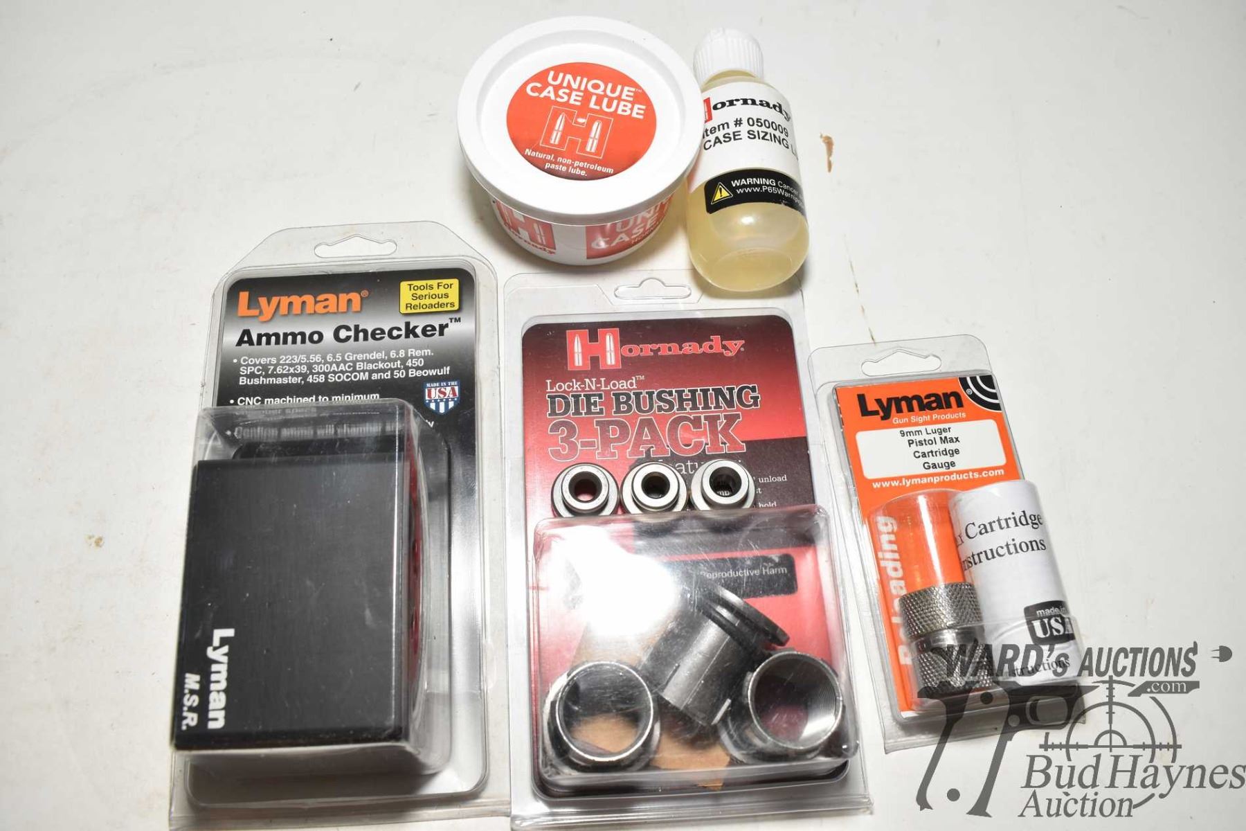 Loading accessories including Hornady Lock-N-Load die bushings, Hornady case lube, Hornady sizing lube, Lyman Ammo checker, Lyman 9mm cartridge gauge and two RCBS #10 shell holders and a #3