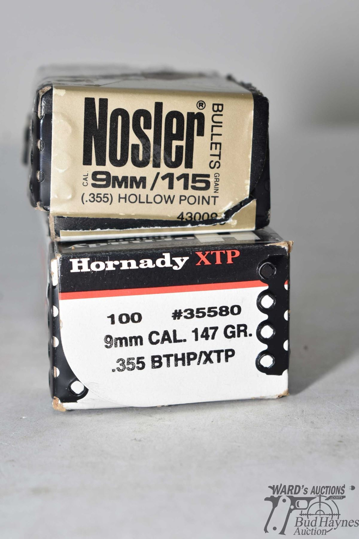 Two full 100 count boxes of 9mm bullets including Hornady XTP 147 gr BTHP and a Nosler 115 gr HP