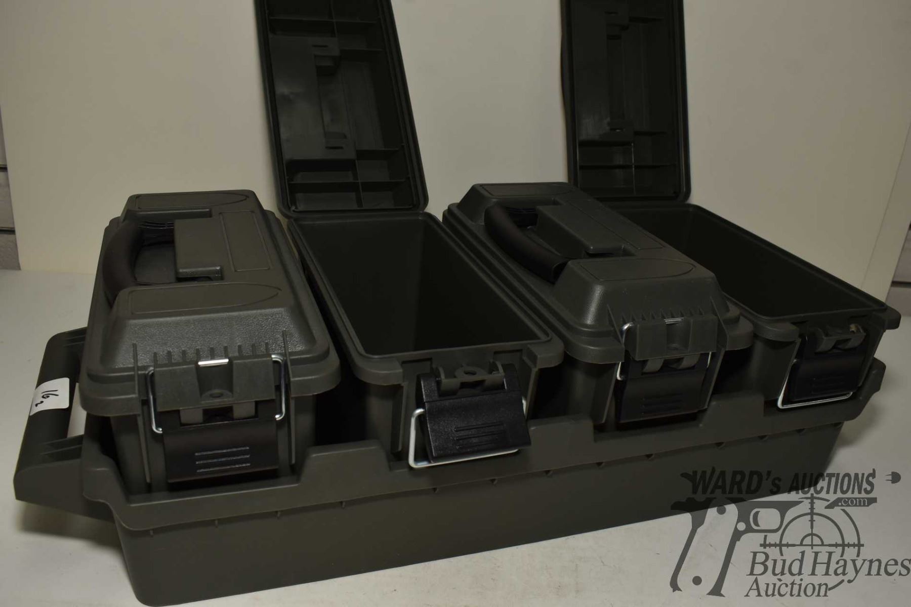 Four plastic ammo boxes in tray, a large 16" x 16" x 8" carry case w/ rifle holders and small ammo c