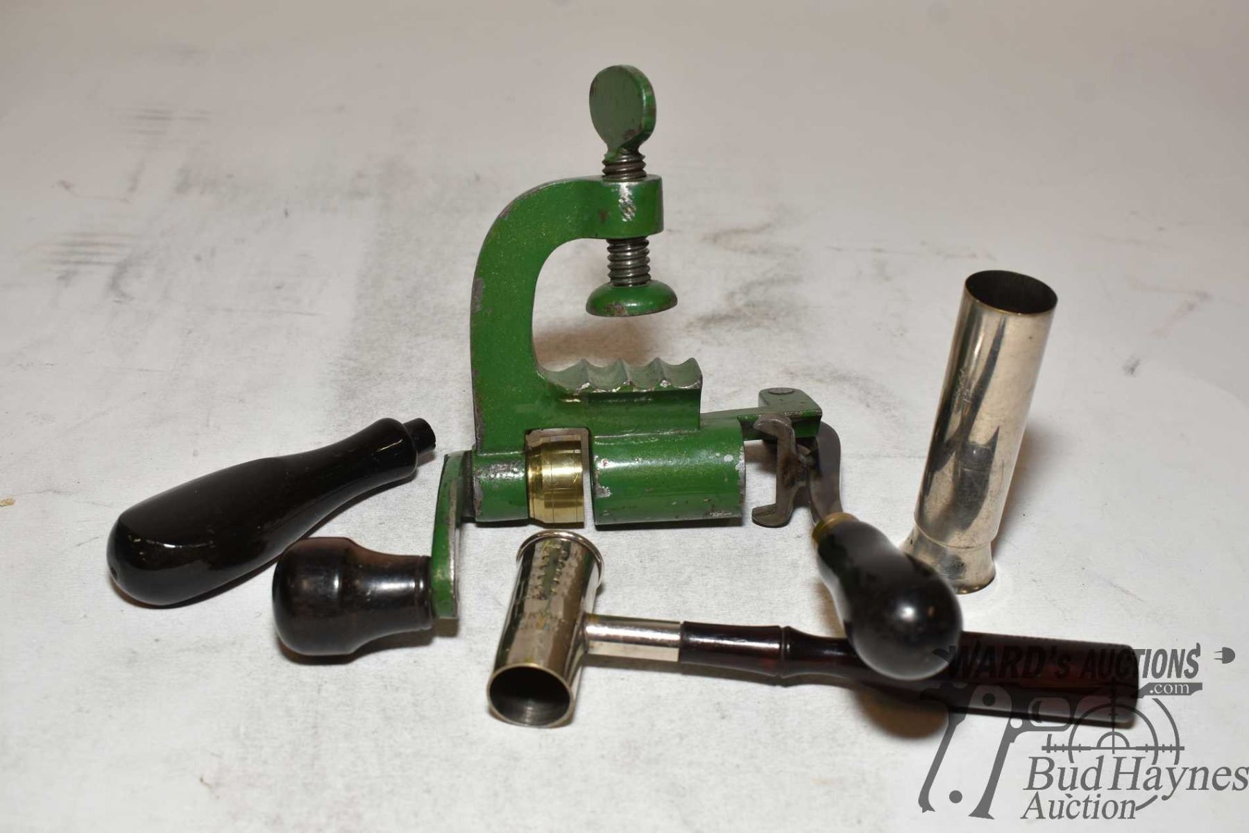 Selection of vintage loading tools including 12 gauge crimp tool, Bridgeport #21 powder measure, Eureka 12 loading tool and an unknown handle
