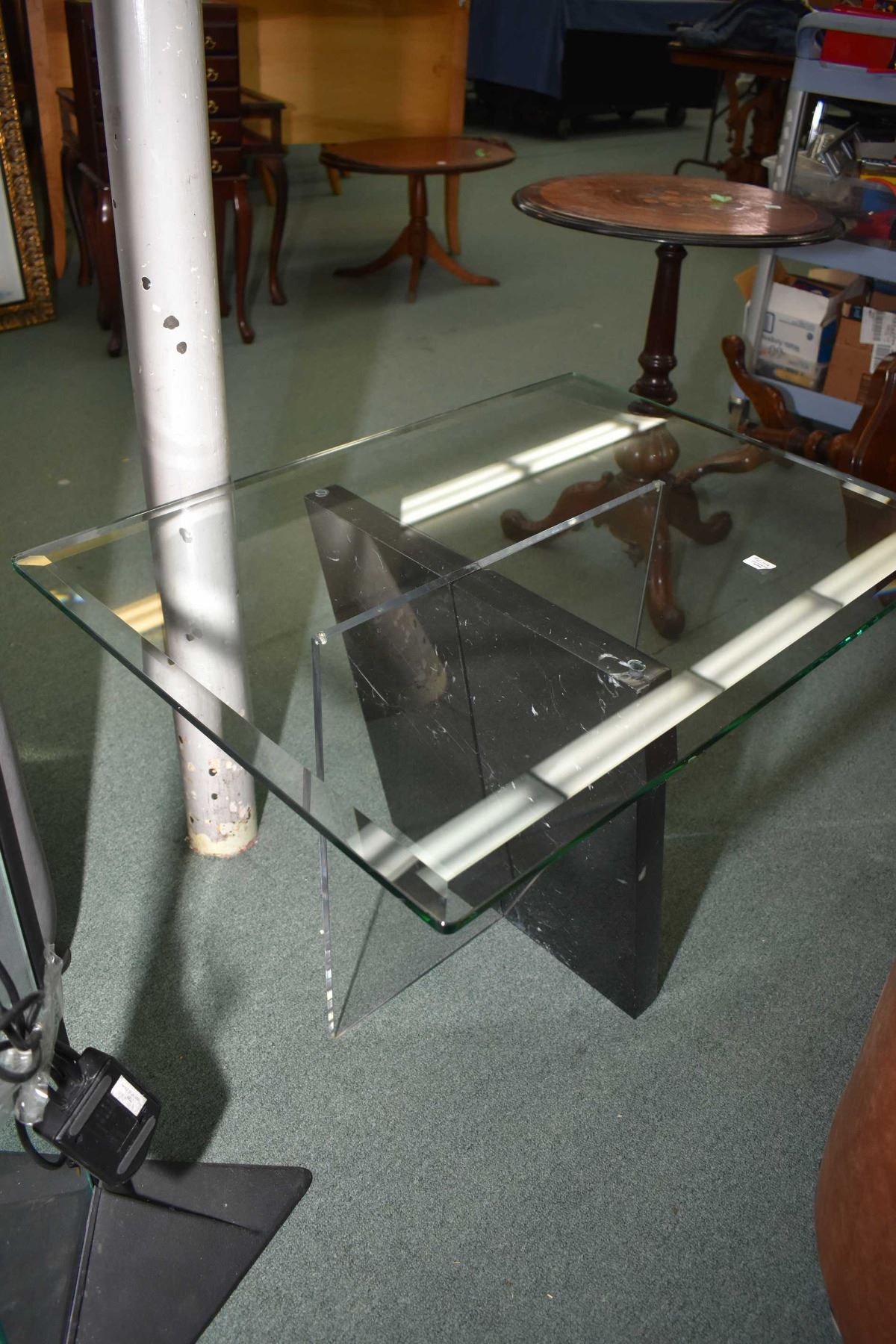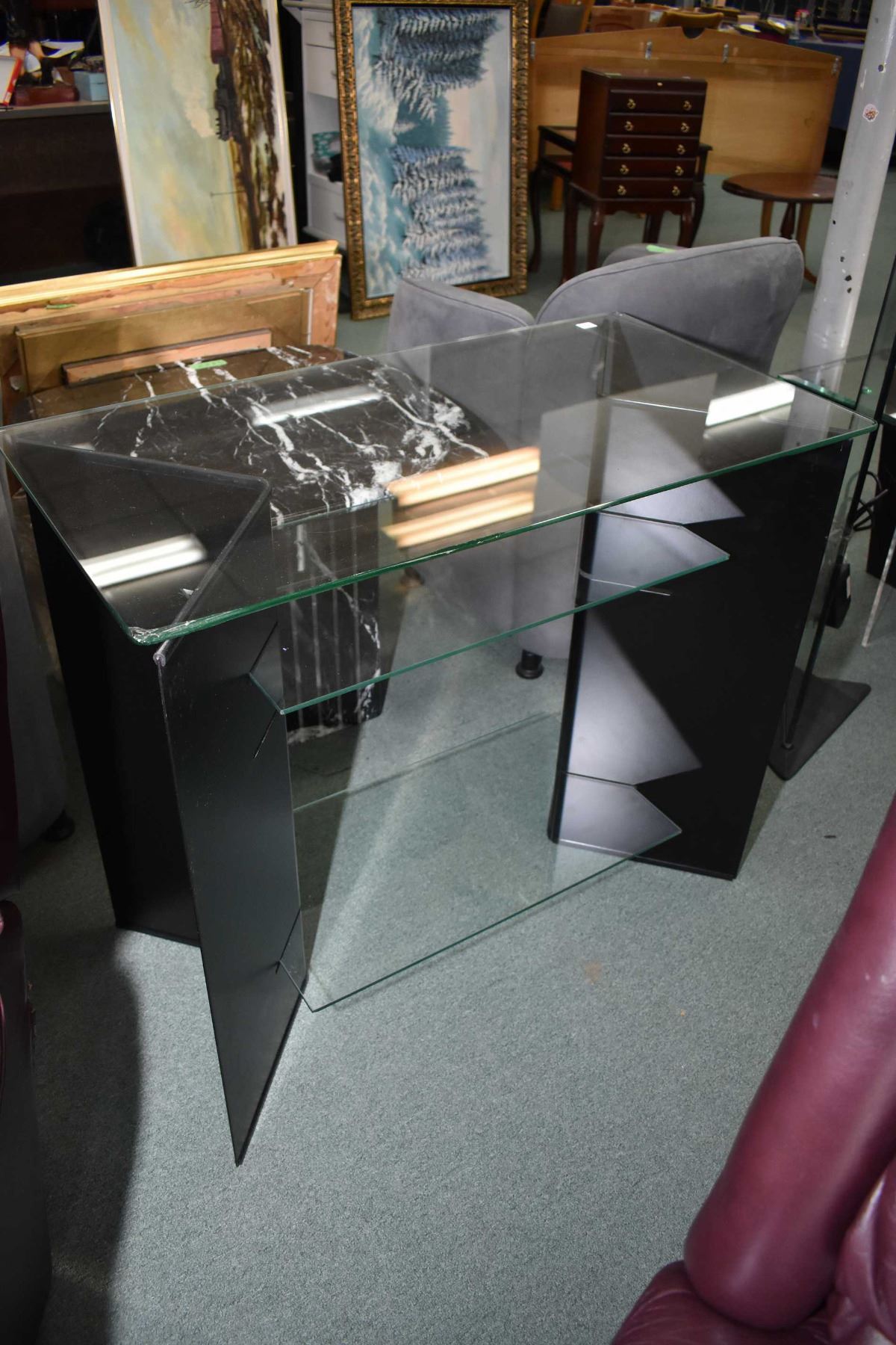 Designer television stand with glass shelves and a marble and glass end table