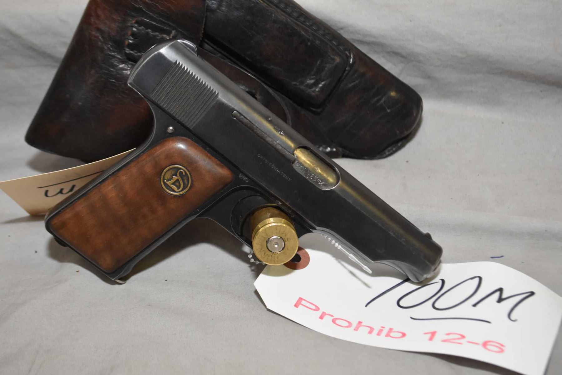 Deutsche Werke Model Ortgies Patent 7.65 MM Cal 8 Shot Semi Auto Pistol w/ 88 mm bbl [ blued finish, walnut Erfurt Work insignia grips, excellent blueing & grip panels, German pocket pistol in caliber 7.65 MM complete with issued holster, Procured for export to foreign countries as per Germany export stamp underside of barrel, correct magazine bearing Deutsche Ortgies cartouche identical to bronze inlay on grip panels, Lazy Crown N proof Circa early 1920's ] Ser # 126887 Prohib 12 - 6 Cert # 11557322 FRT # 18484 - 3