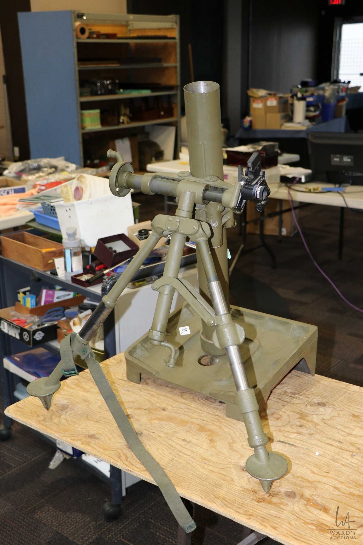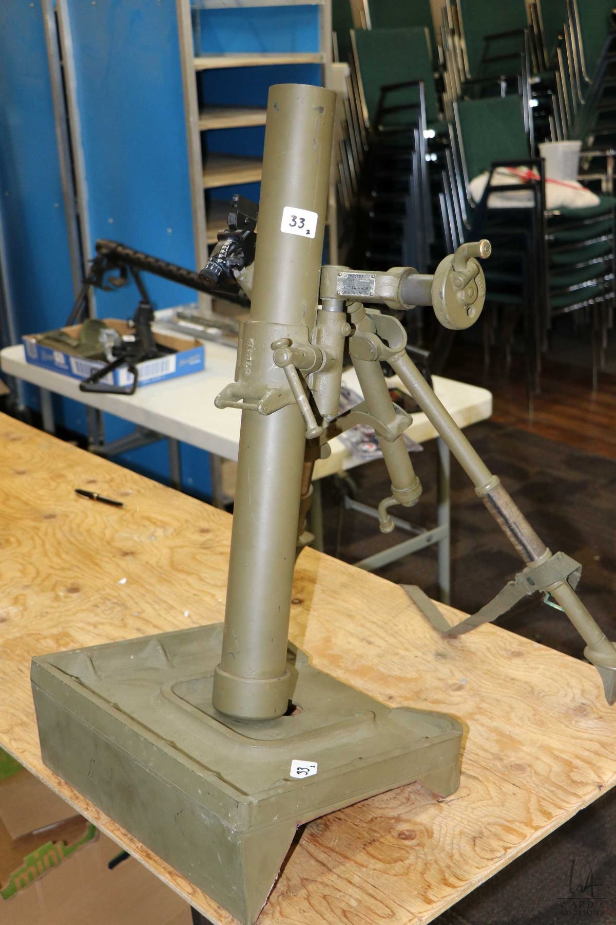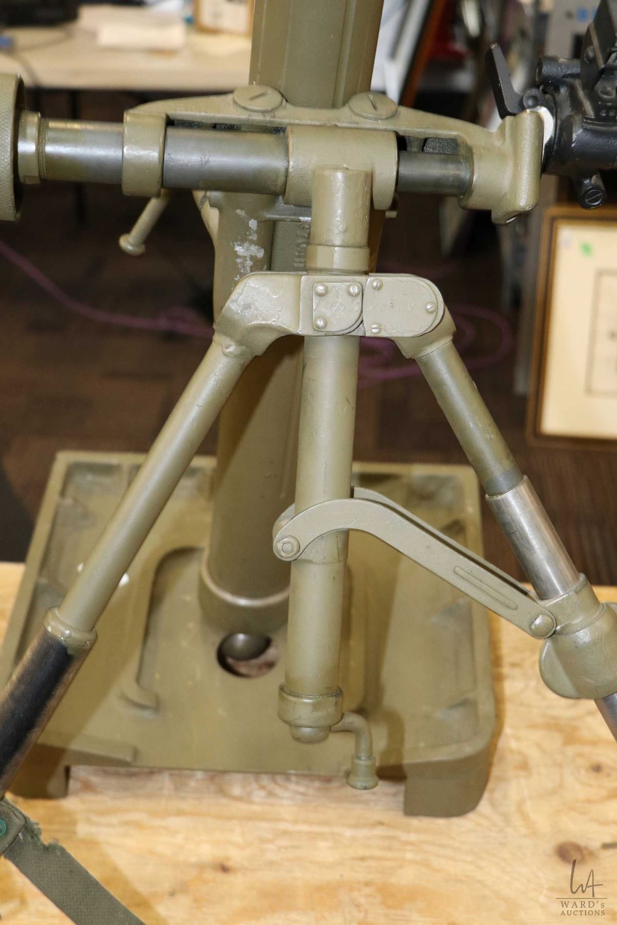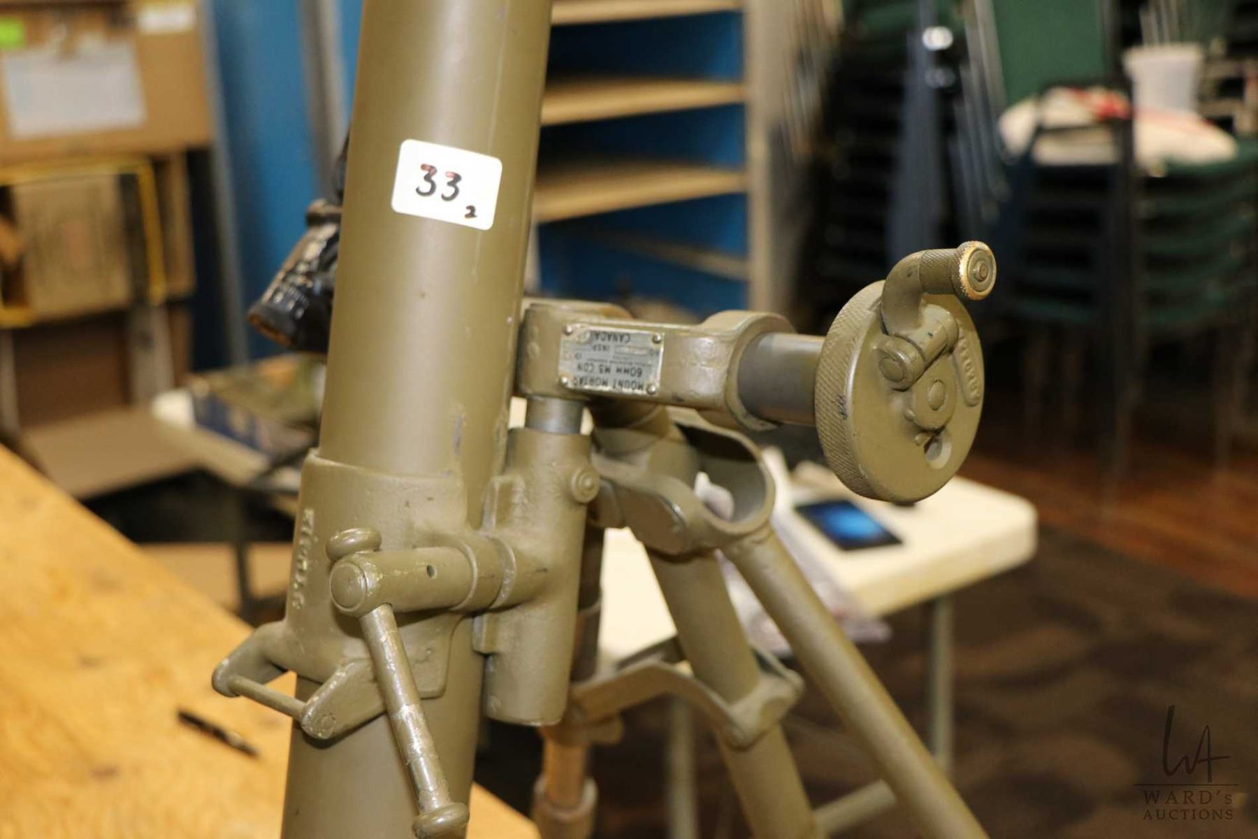 Dewatted Canadian M-5 60mm mortar with M4 sight system, on adjustable base, made by Turnbull Elevator Company.