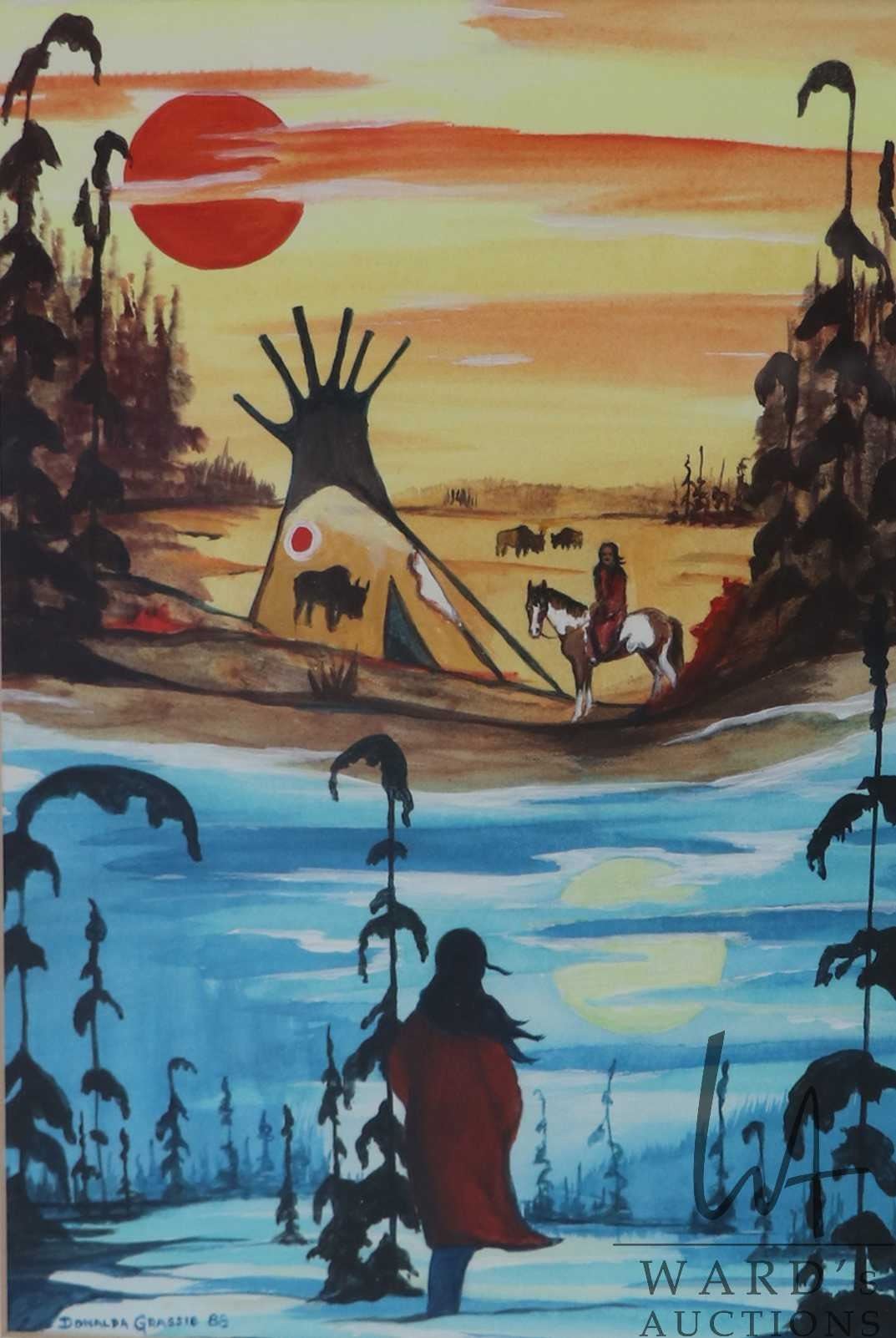 Donalda Grassie original gouache/ watercolour on paper dyptch style painting of what appear to be a spiritual look back in time, 12" X 9"