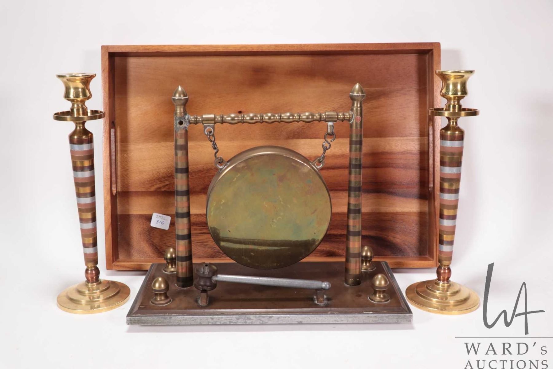 Double handled treenware serving tray plus artisan crafted table gong and candlestick, made by turning different types of metals including brass, aluminum, bronze etc.
