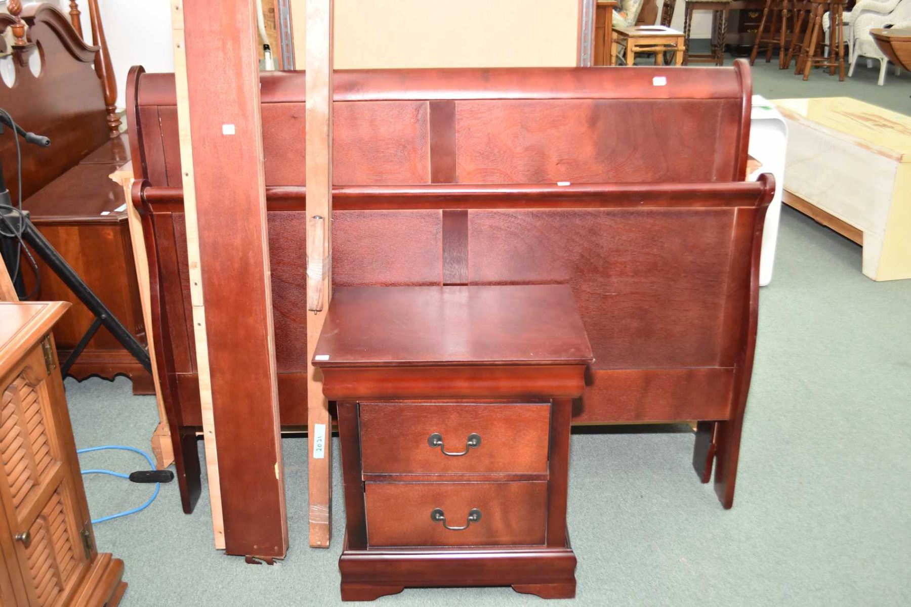 Double sized semi contemporary sleigh bed, headboard, footboard and rails plus a two drawer night table