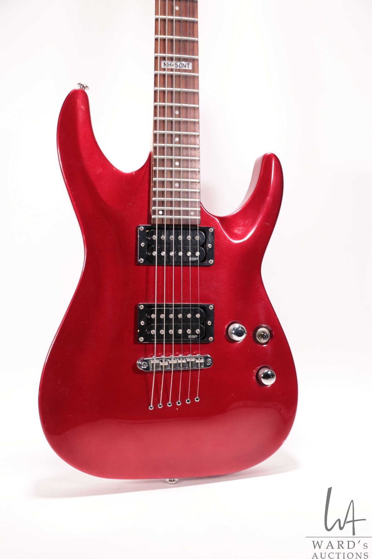 ESP Ltd. MH-50NT guitar with "string-thru-body" bridge design, ESP Humbucker pickups, in scarlet red