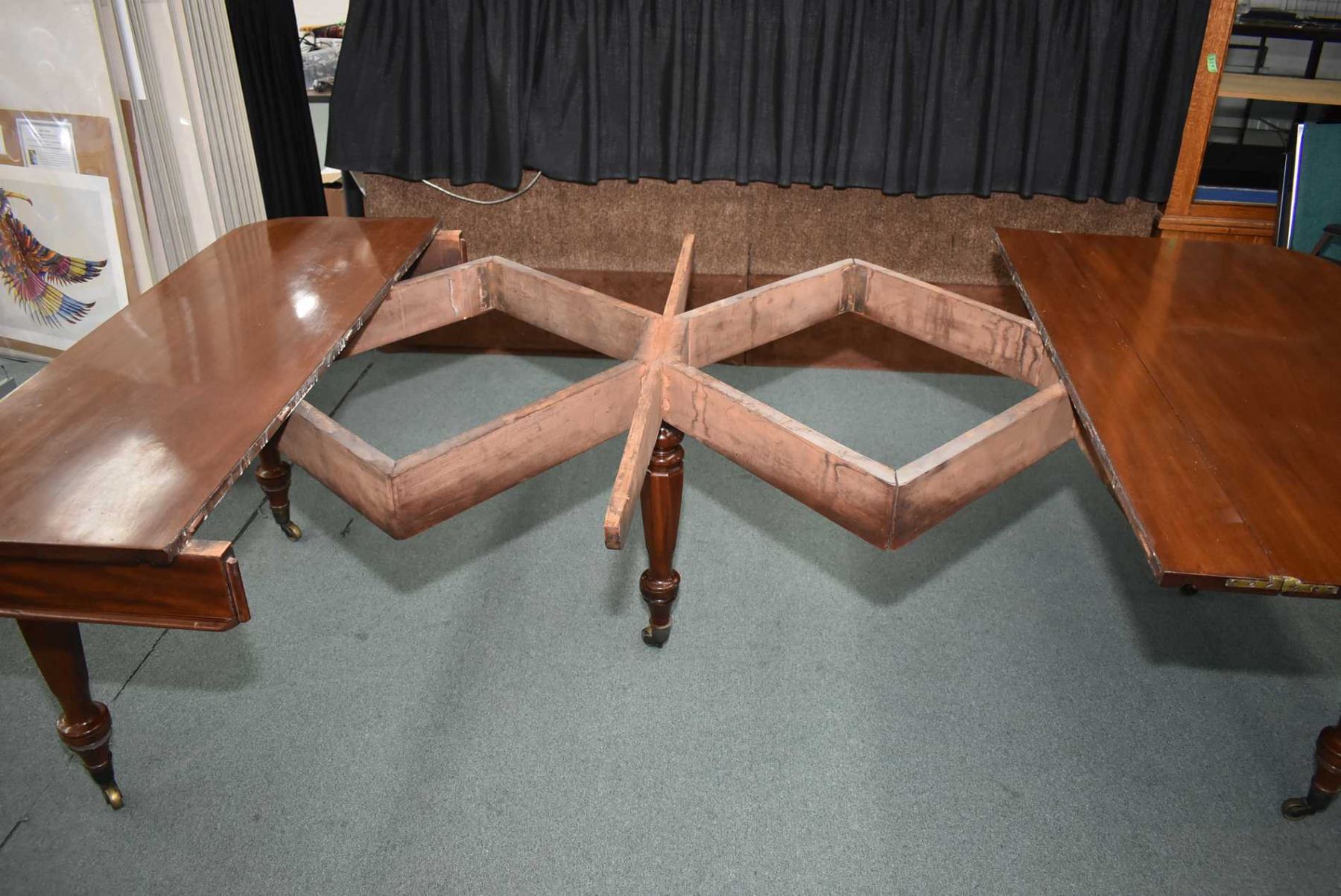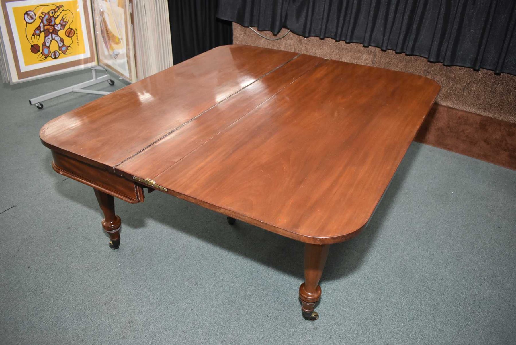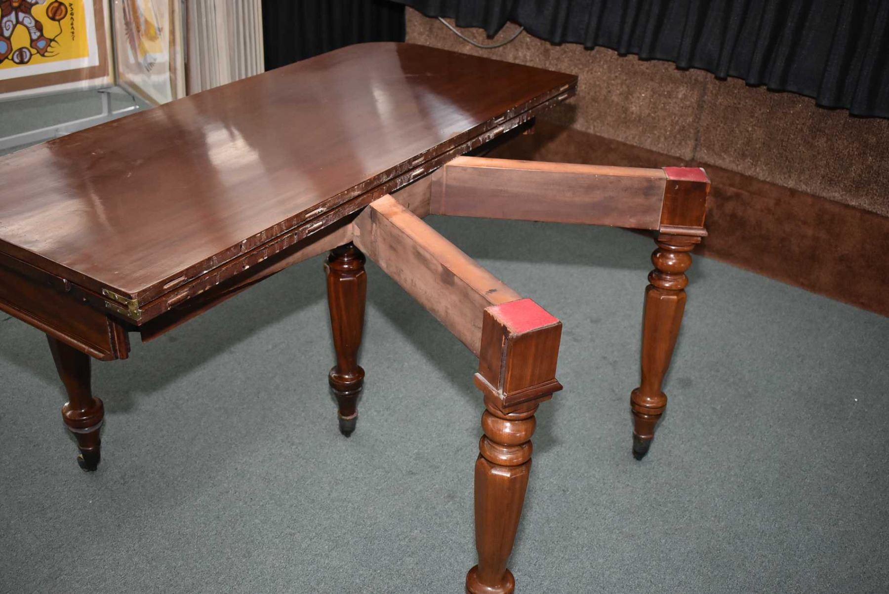 Early 19th century mahogany "D" shaped dining fold over table standing on four turned supports with octagonal motif and matching center support for the leaves, all with brass castors. The supports fold out to support it when it is opened. It is approximately 29 1/2" X 54", There are two leaves, each approximately 23 3/4"