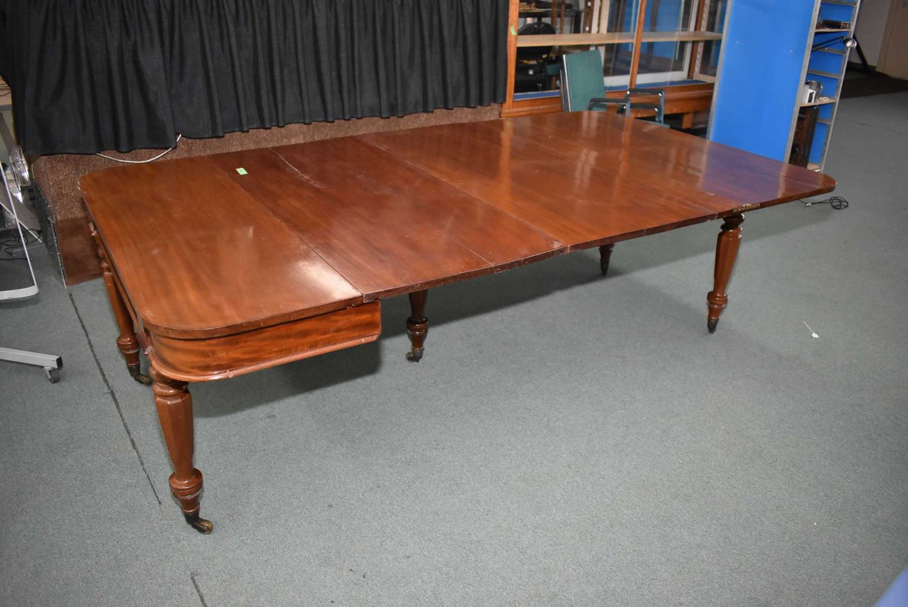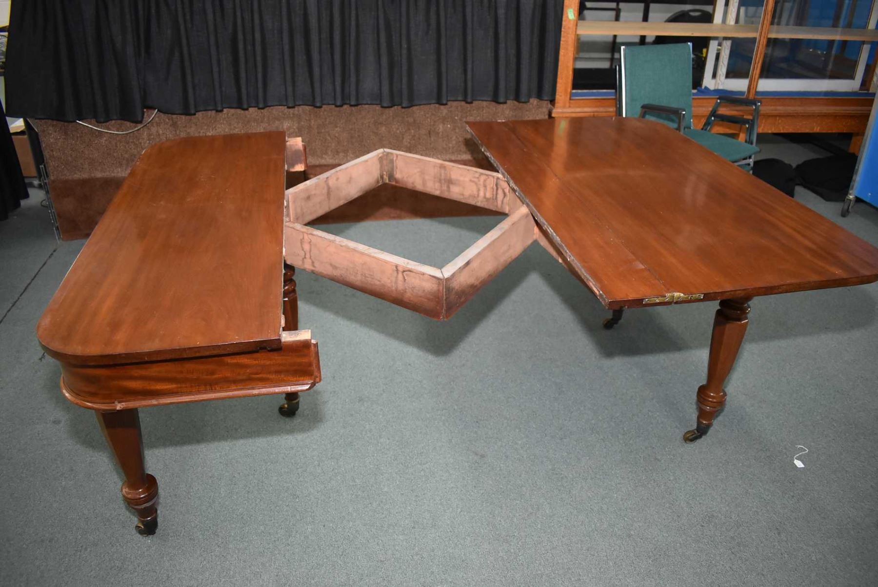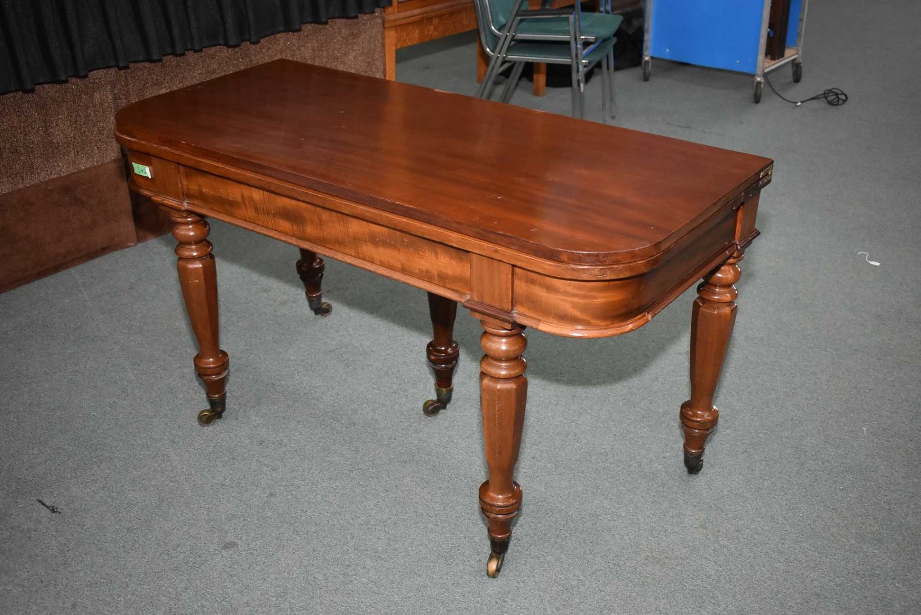 Early 19th century mahogany "D" shaped dining fold over table standing on four turned supports with octagonal motif and matching center support for the leaves, all with brass castors. The supports fold out to support it when it is opened. It is approximately 29 1/2" X 54", There are two leaves, each approximately 23 3/4"