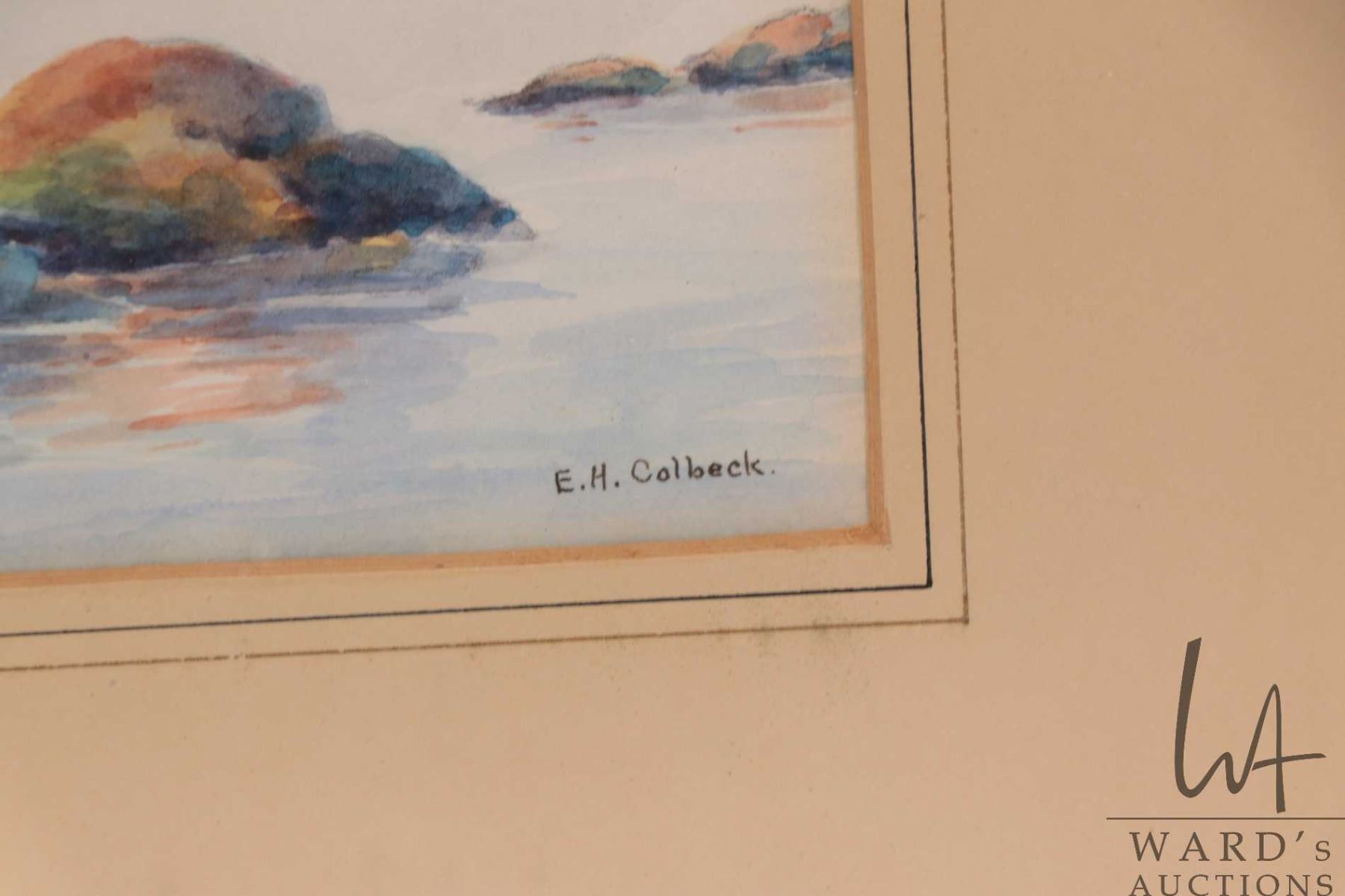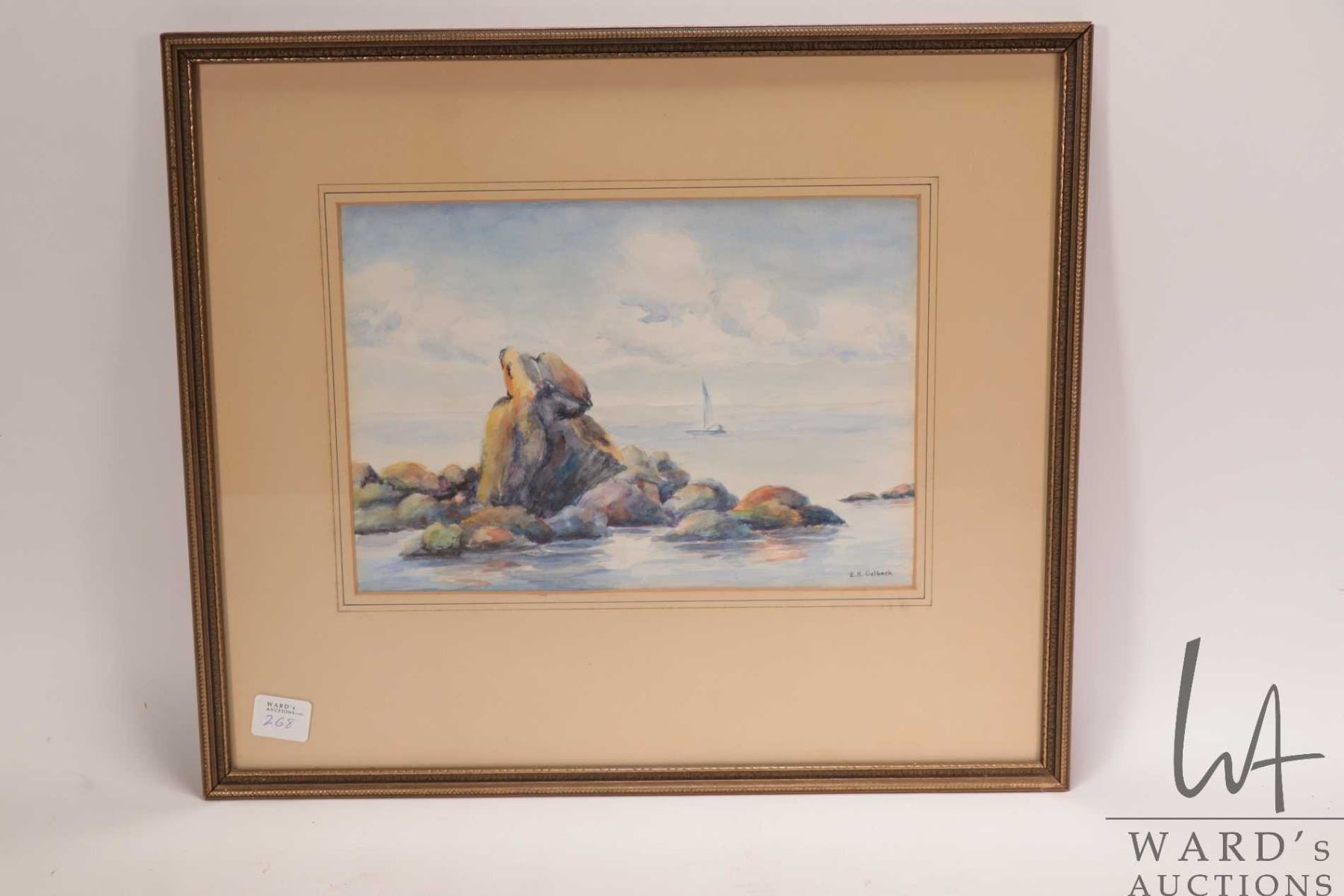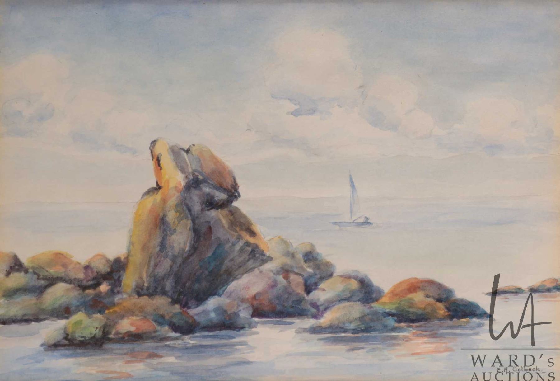 Edna Honeyford Colbeck ( 1892-1977) framed original watercolour painting of sailboat as seen from the shore, 6 3/4" X 9 3/4"
