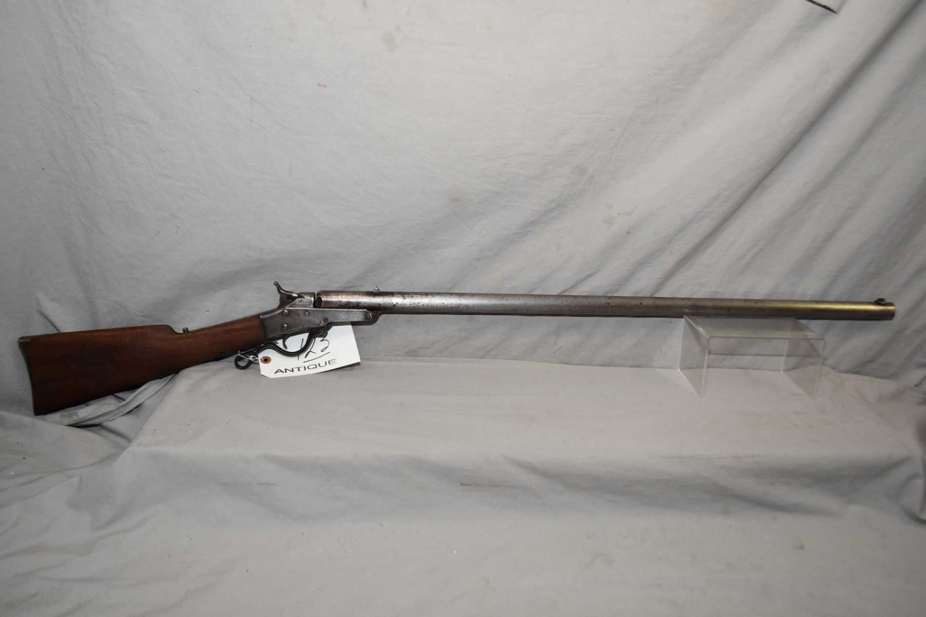 Edward Maynard ( Mass. Arms Co. Chicopee Falls) Model Improved Mid - Range Target / Rifle No. 10 .40/ 60 Maynard Cal Single Shot Breech Loading Rifle with rare 32" round bbl [ blued finish turning brown in protected areas, fading to grey in most, frame dated 1873 with barrel sights, missing the tang sight, wooden stock with hand checkered six sided star carved in it, metal carbine style butt plate, Note : Space between barrel and receiver, for thick rimmed .40 - 60 Maynard case, fluted sides at breech end for finger removal of rimmed case ] Ser # 27027 ANTIQUE NO PAL REQ