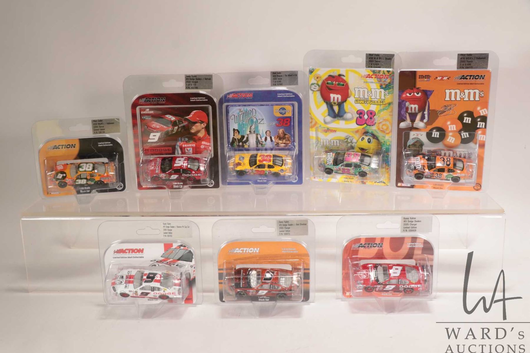 Eight 1: 64 scale die cast collectible race cars including Kasey Kane 2004-2005 and Elliot Sadler 2003-2004