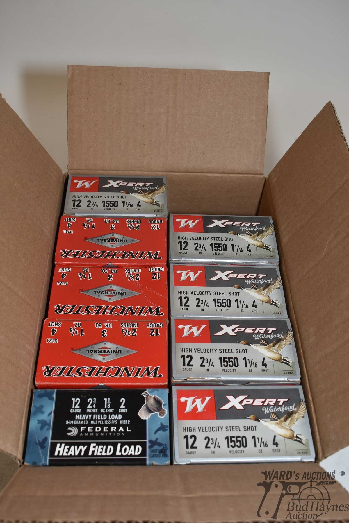 Eight 25 count boxes of Winchester 12 GA 2 3/4" #4 including five Xpert waterfowl and three Universal, plus a 25 count box of Federal 12 GA 2 3/4" #2