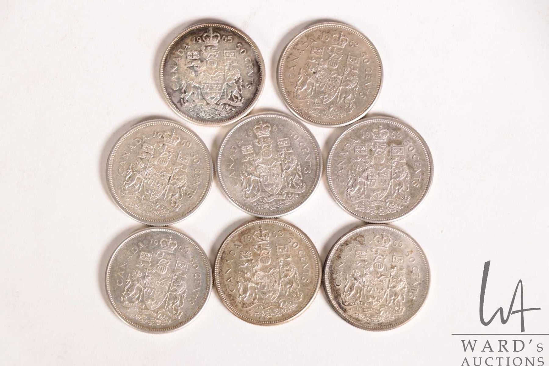Eight Canadian 50 cent coins including 1960, 1962, two 1963, 1964, 1965, and 1966