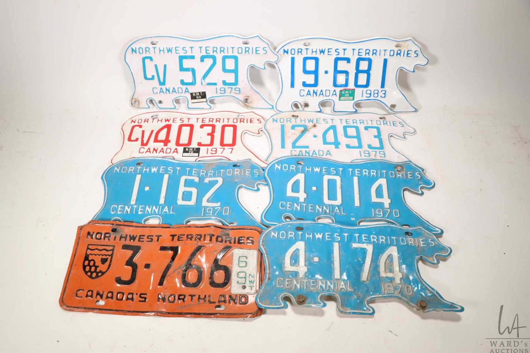 Eight Northwest Territories vintage licence plates including a 1966 with a 1969 decal, three 1970, 1977, two 1979 and a 1983