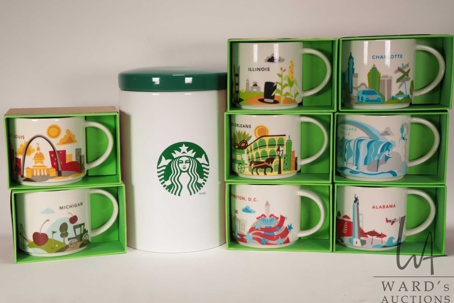 Eight Starbucks coffee mugs from the "You Are Here" collection including Alabama, Niagra Falls, Illinois etc. plus a Starbucks canister