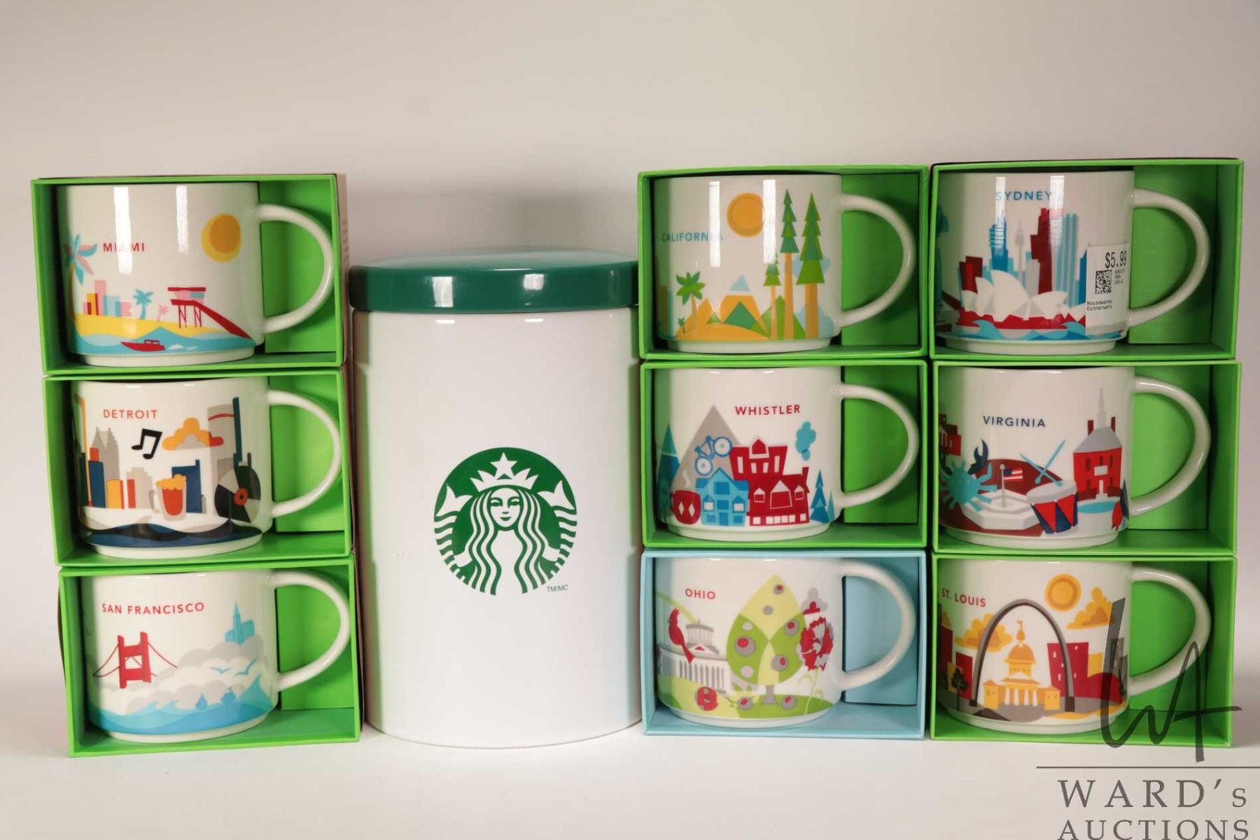 Eight Starbucks coffee mugs from the "You Are Here" collection including Whistler, Miami, St. Louis etc. plus a Starbucks canister