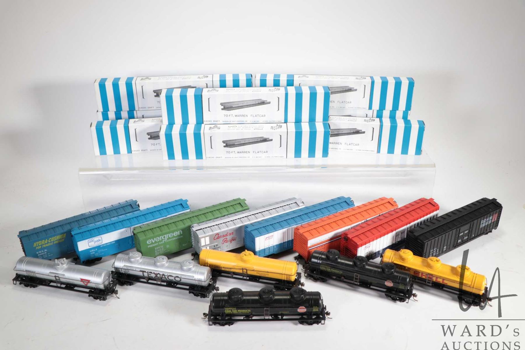Eight boxed 70 ft. Warren flatcars, eight box cars and six tankers, all HO scale