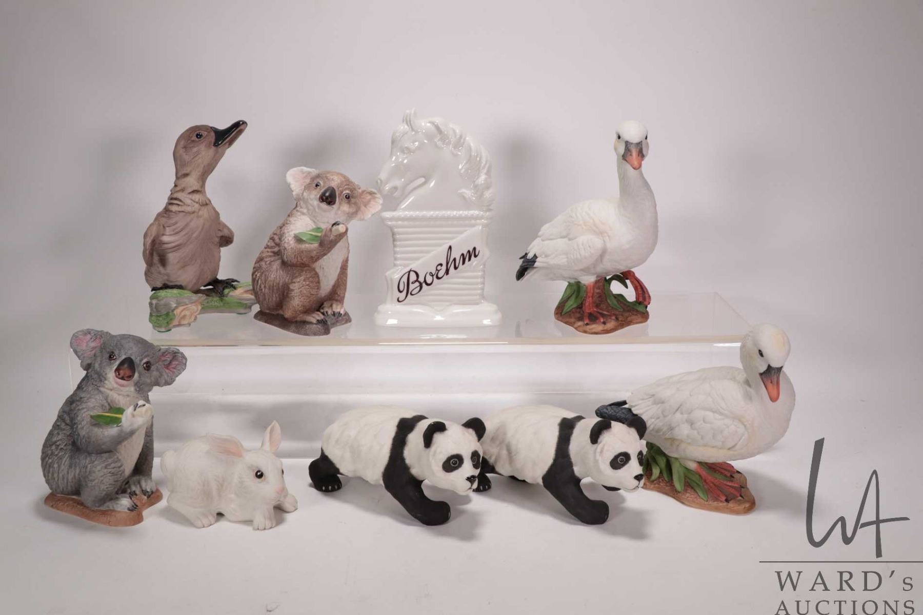 Eight collectible Boehm animcal figures including swans, Koala and panda bears, duckling and rabbit plus a glazed pottery "Boehm" retail sign NOTE: SHIPPING IS NOT AVAILABLE, LOCAL PICK UP ONLY