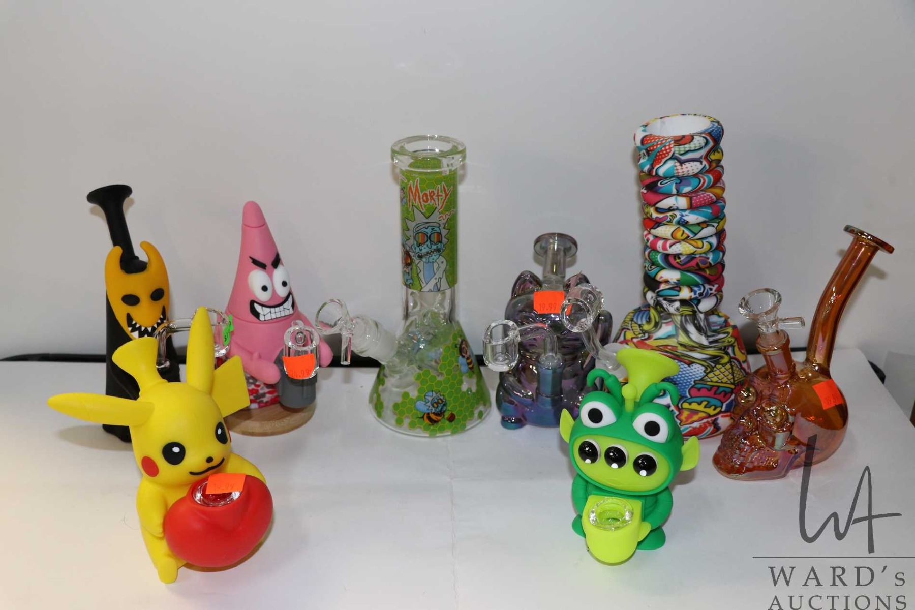 Eight glass and plastic water pipes Age Appropriate Canadian Buyers Only