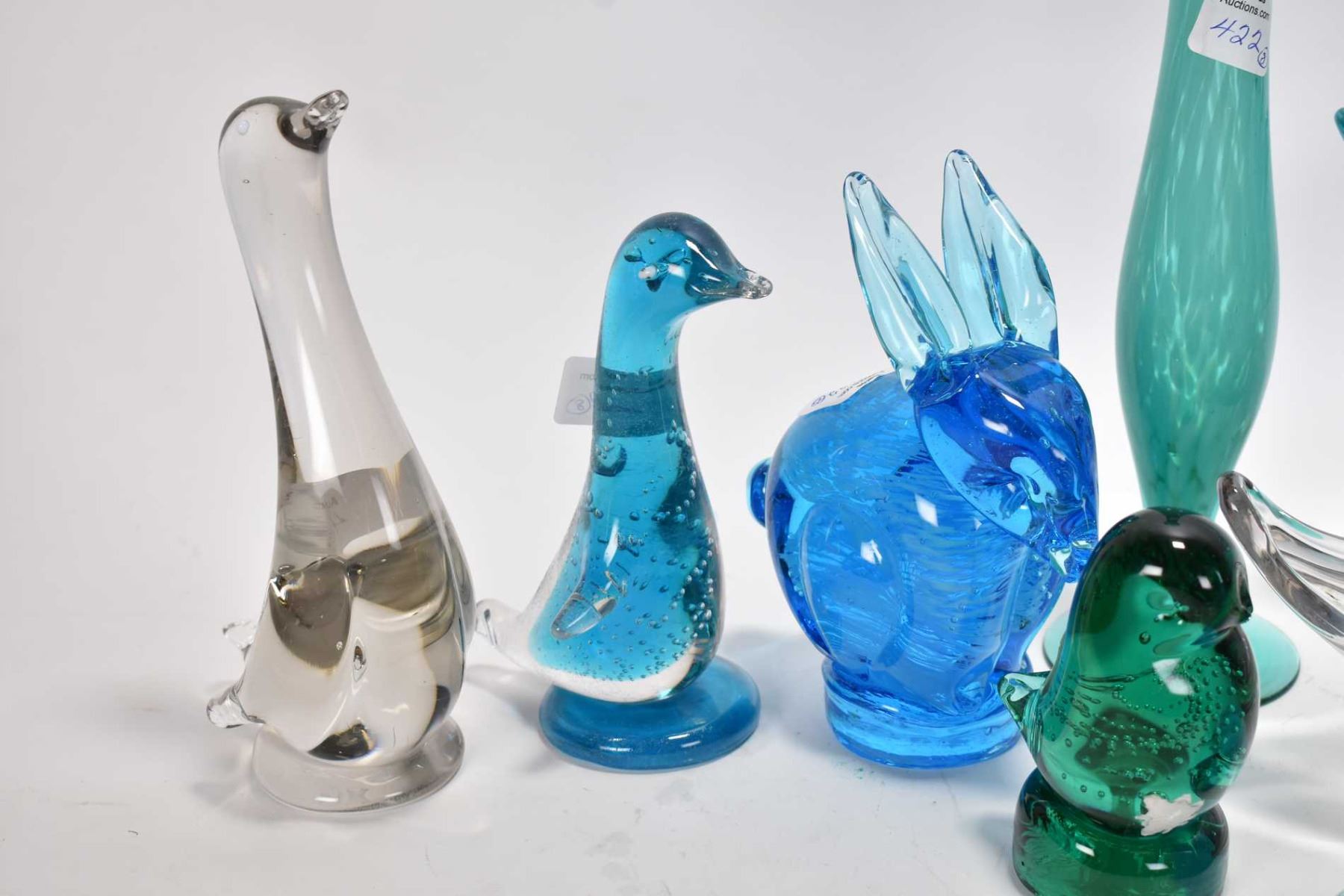 Eight pieces of art glass including animals, two graduated dishes and a bud vase, one with Alta glass label and one signed