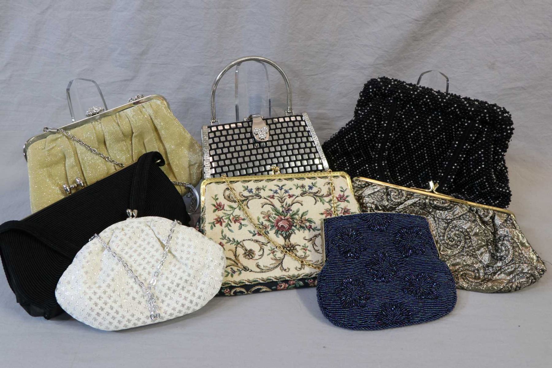 Eight vintage evening purses including beaded, clutch purses, metallic etc.