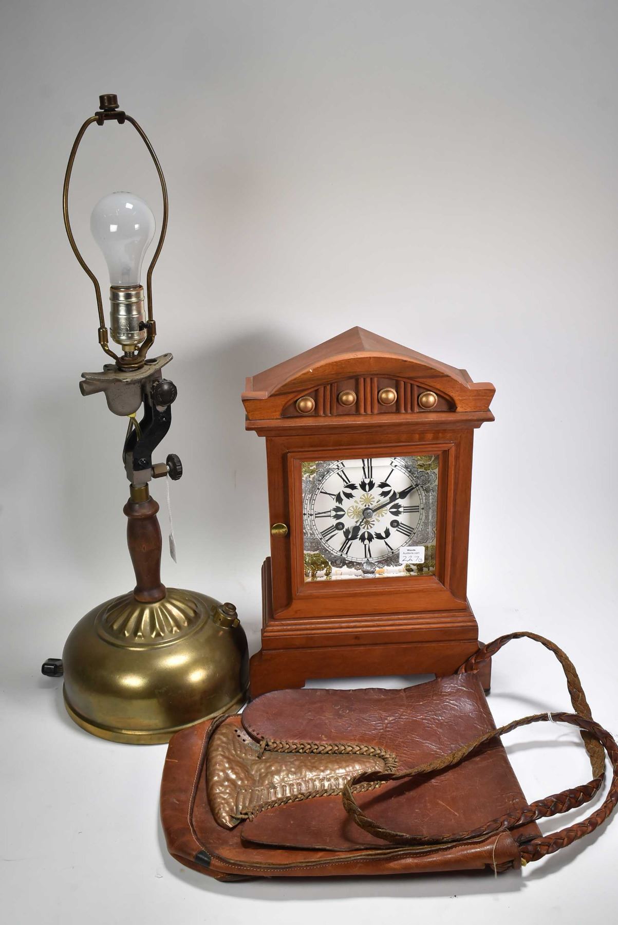 Electrified brass oil lamp, leather satchel with copper decoration and wooden mantle clock, trying to work at time of cataloguing