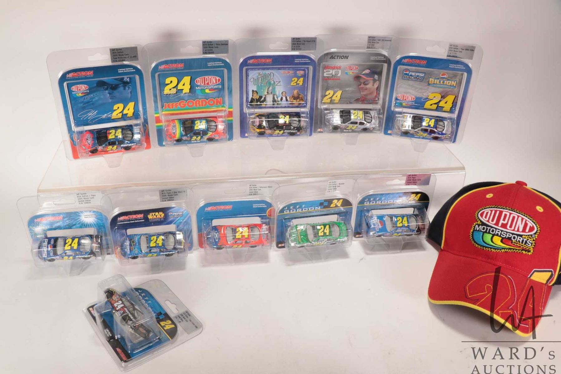 Eleven 1: 64 scale die cast collectible Jeff Gordon race cars and a Du Pont Motorsport ball cap