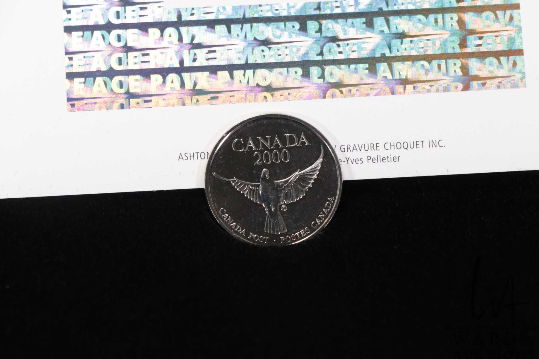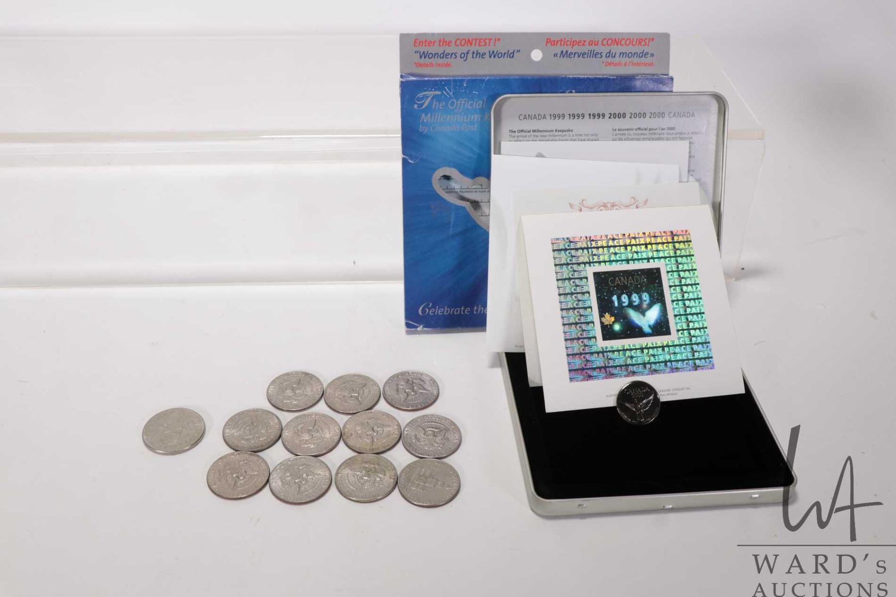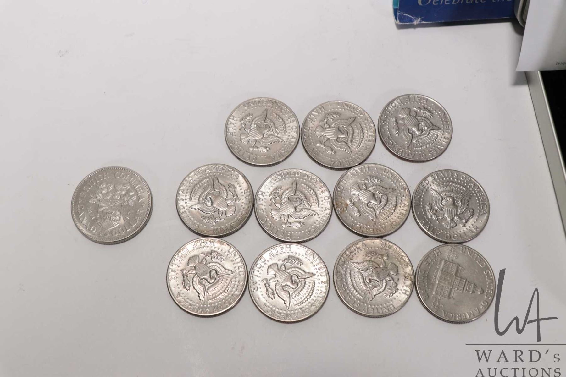 Eleven American fifty cent pieces ranging from 1971-1976, 1971 British Columbia Canadian dollar and Canadian Millenial cased stamp