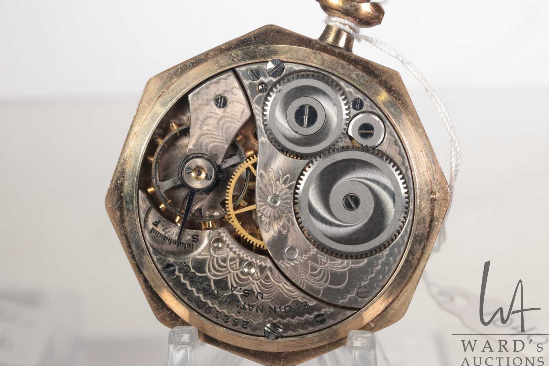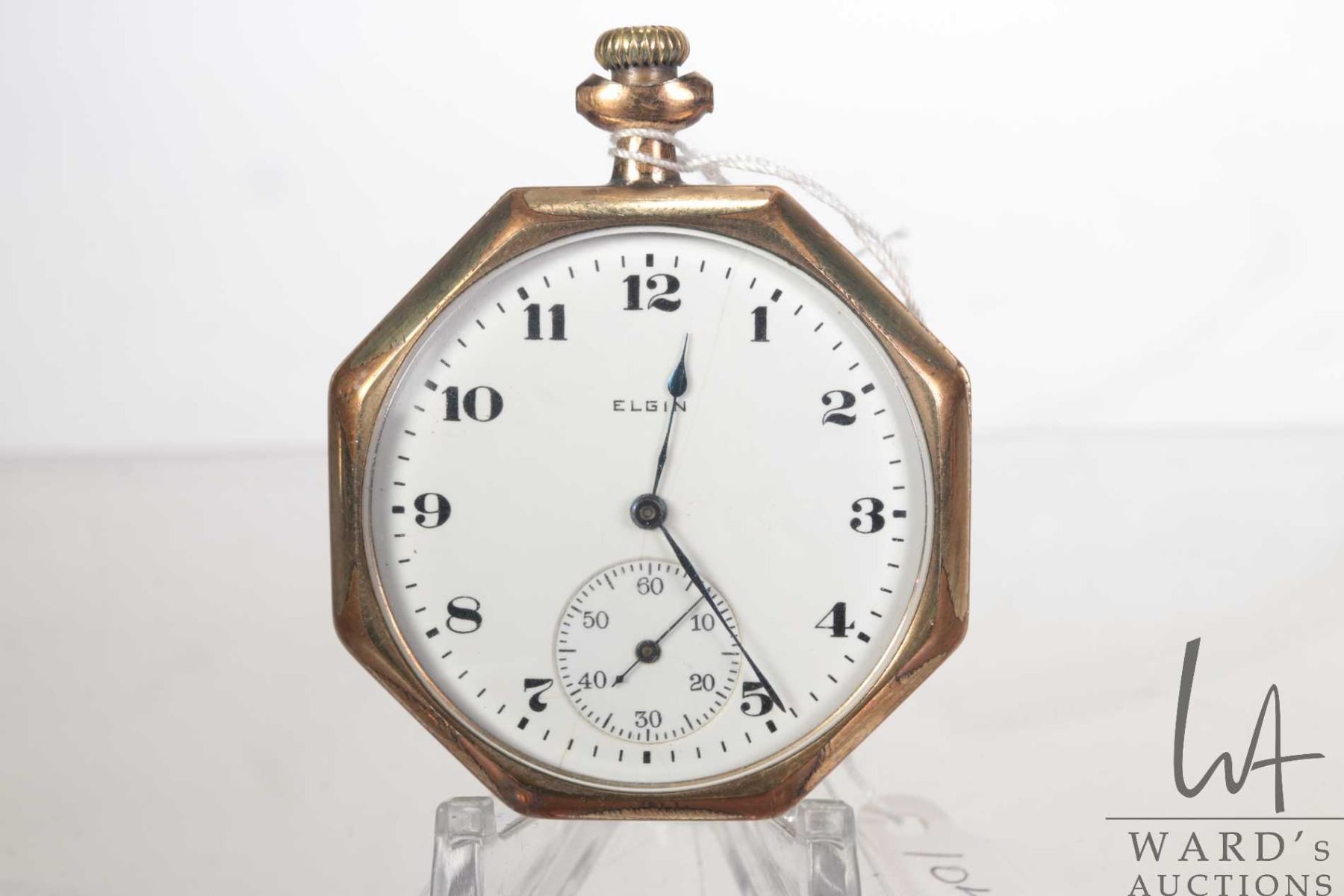 Elgin National Watch Co. grade 303, model 3, 7 jewel pocket watch. White enamel single sunk dial with second sweep and Arabic numerals note faint spider crack near between 12 and 1 o'clock. In Illinois gold plated Napoleon watch case. Size 12, serial no. 25219070. Circa 1923. Working at time of cataloguing