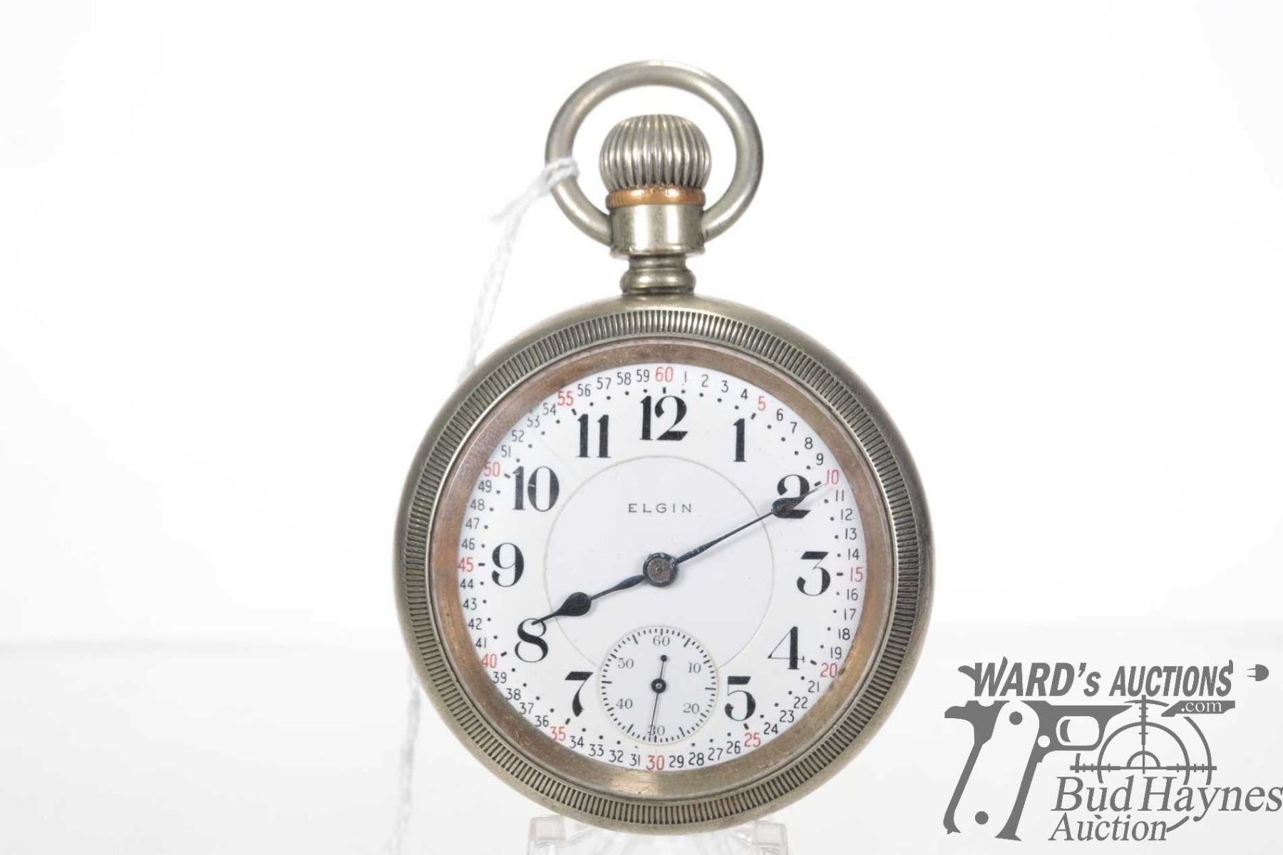 Elgin Watch Co. pocket watch, grade 349, model 7, 21 jewel, serial no. 15227152, size 18. White double sunk dial with second sweep and Arabic numerals. In Elgin nickel silver open face case. Working at time of cataloguing