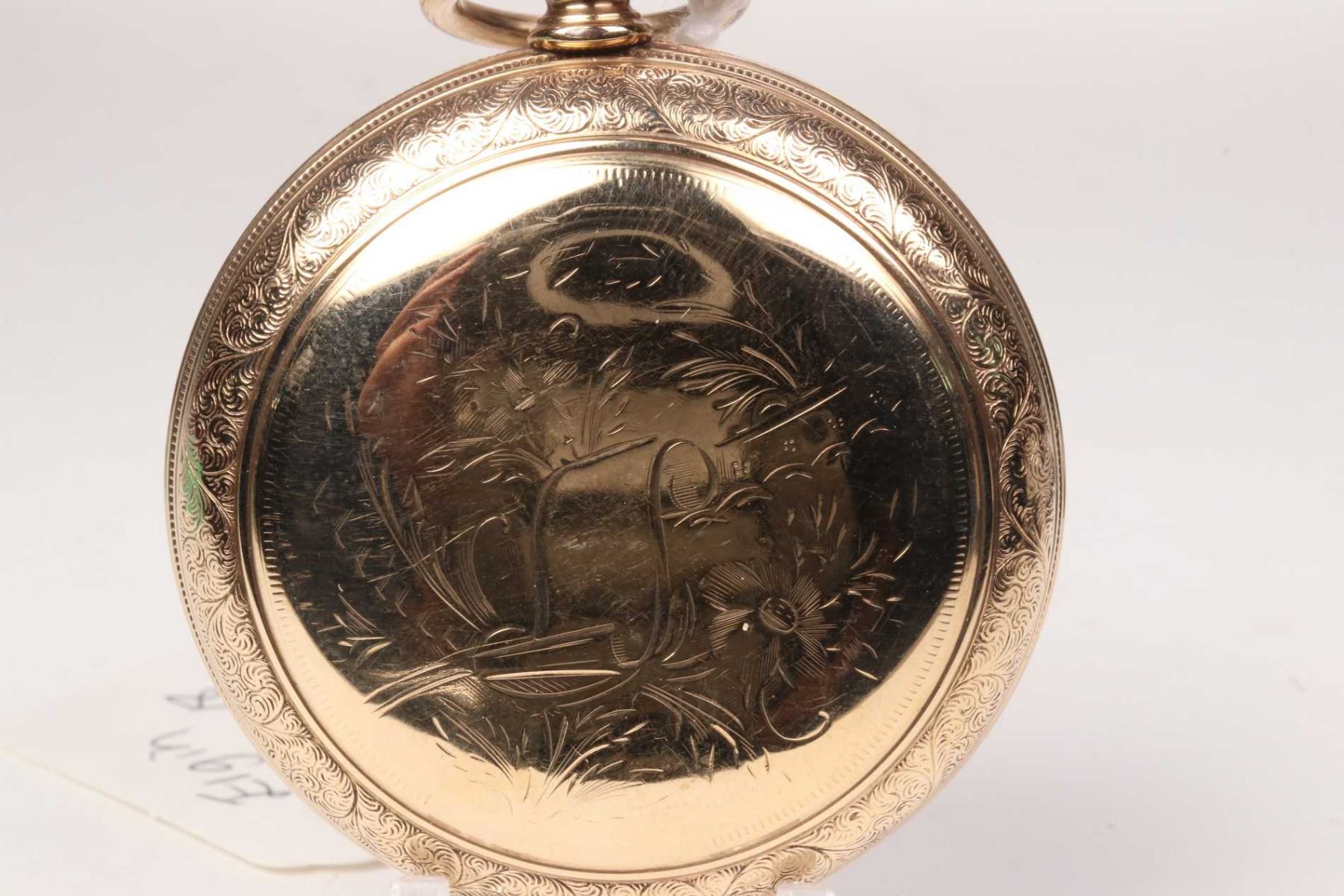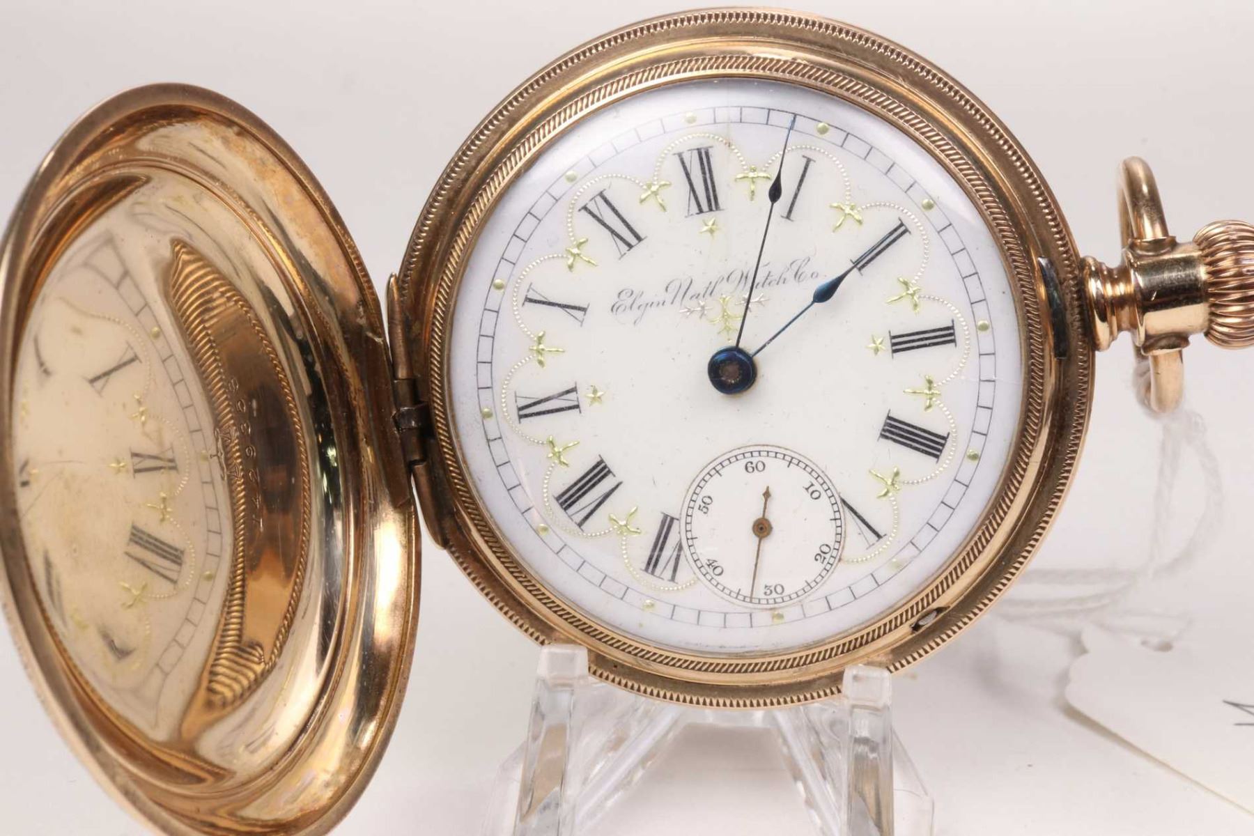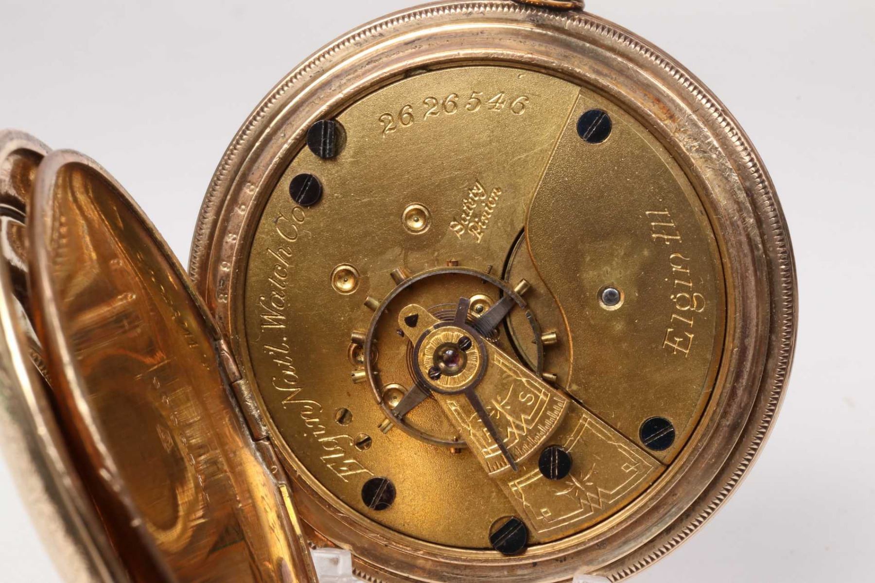 Elgin size 18, 7 jewel, grade 96, model 4 pocket watch. Serial # 2626546 dates this watch to 1888. Full gilt plate stem wind and lever set sidewinder movement signed Elgin National Watch Co. Elgin Ill. comes with a fancy yellow dial with gold accents and black Roman numerals and matching blue spade style hands. Housed in a triple hinged gold filled Keystone case ornately engraved with leaf and floral cottage scene. Working at time of cataloguing