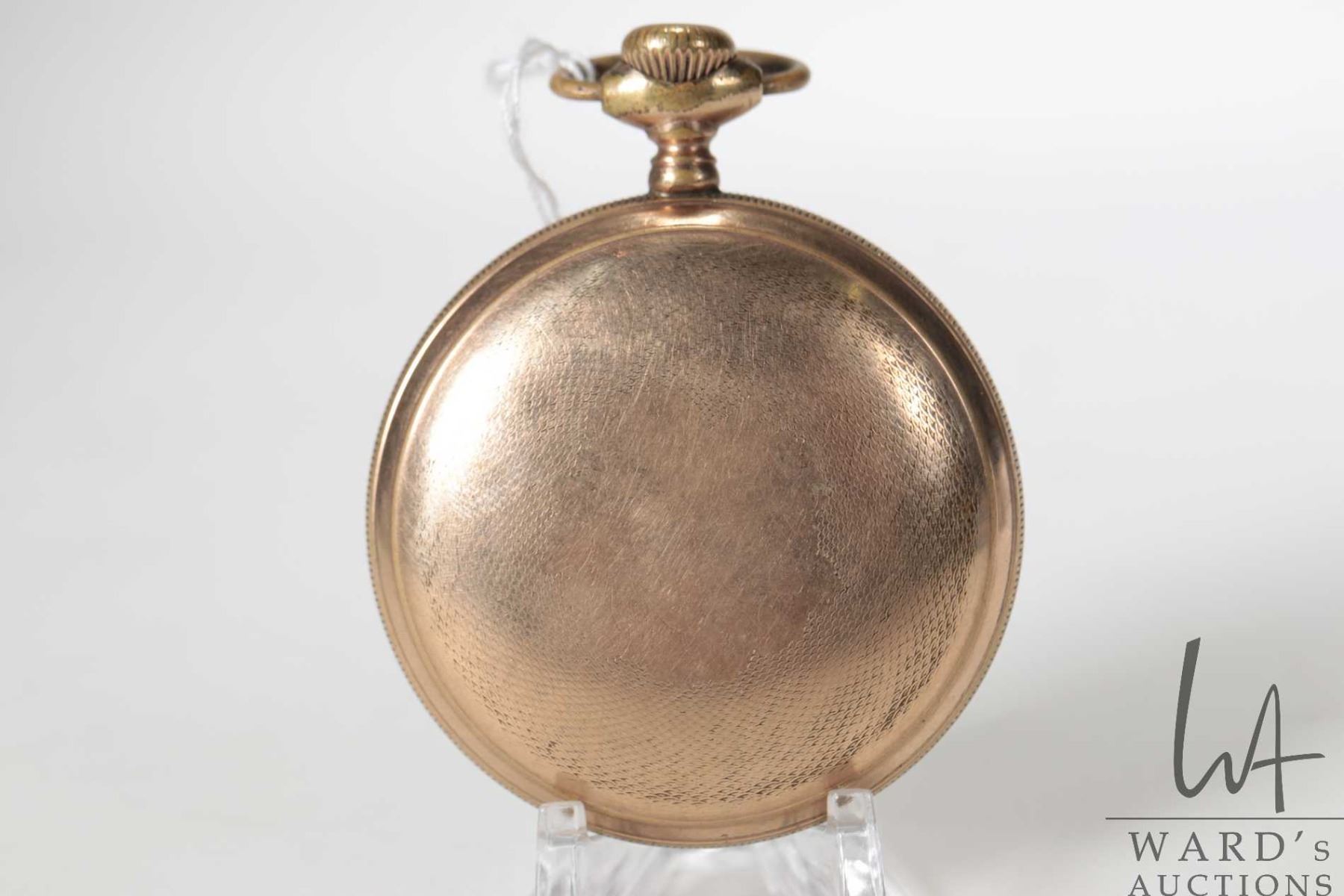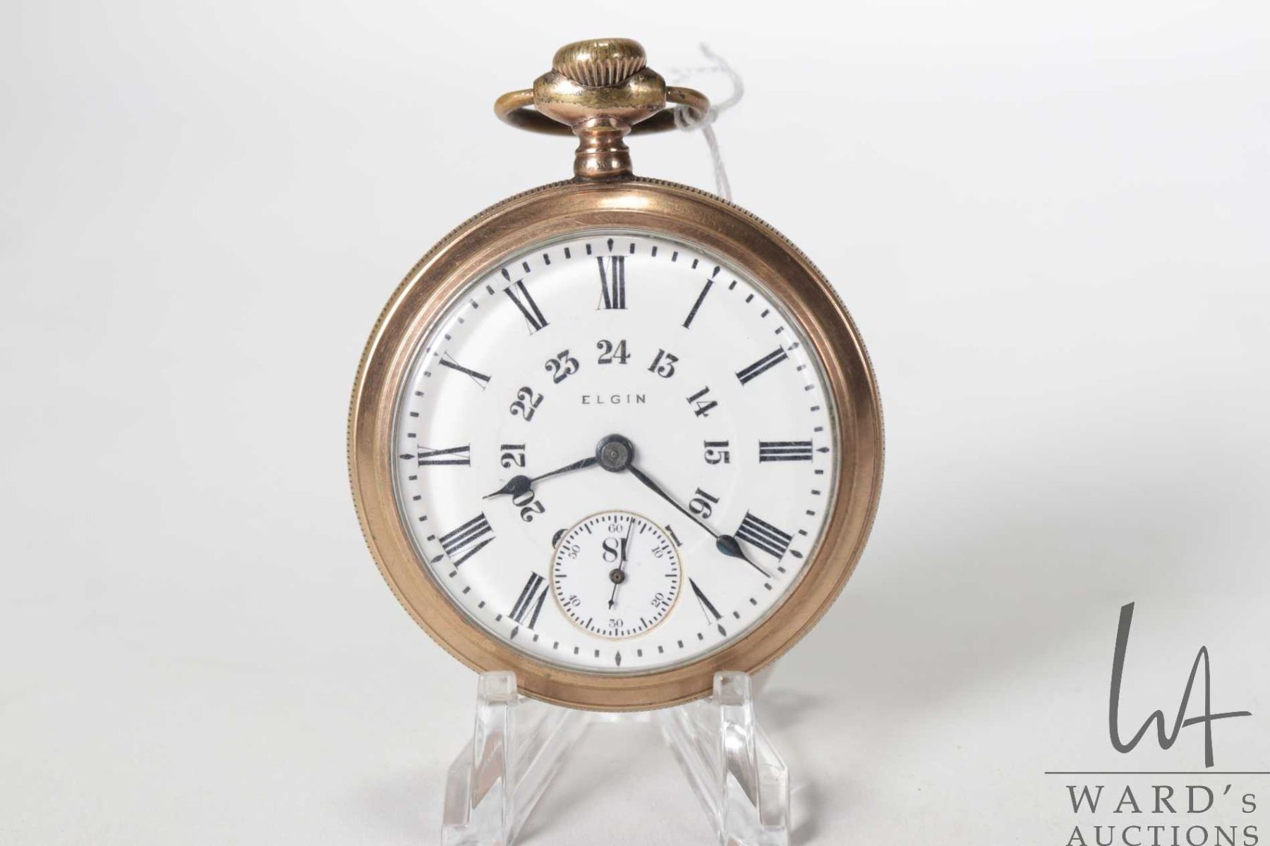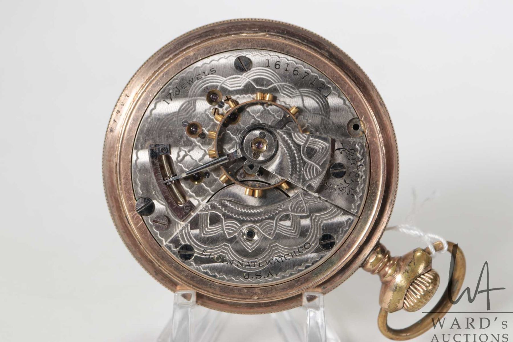 Elgin size 18s, 17 Jewel, Grade 379, model 5. Serial No. 16167121. Estimated production year of 1912. Full nickel plate, stem wind and set. Movement signed Elgin Nat'l Watch Co. U.S.A. Single sunk porcelain, black roman numerals and Arabic numbers, blued spade hands. Housed in a A.W.C.Co case. Working at time of cataloguing