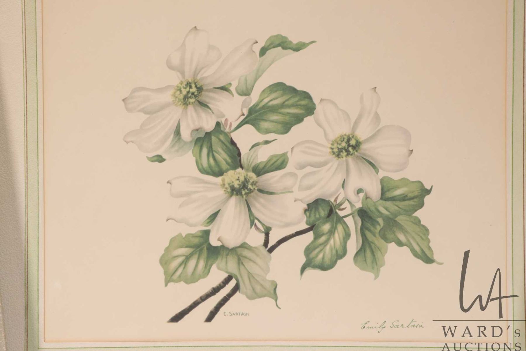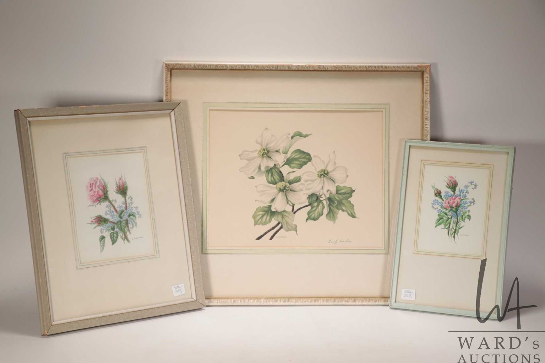 Emily Sartain, two framed original watercolour florals including "Moss Rosebud and Forget-Me-Nots" 6 1/4" X 4 1/2", "Moss Rosebud and Forget-Me-Nots", 7 1/2" X 6" and a "Dogwood Blossoms" print by the same artist