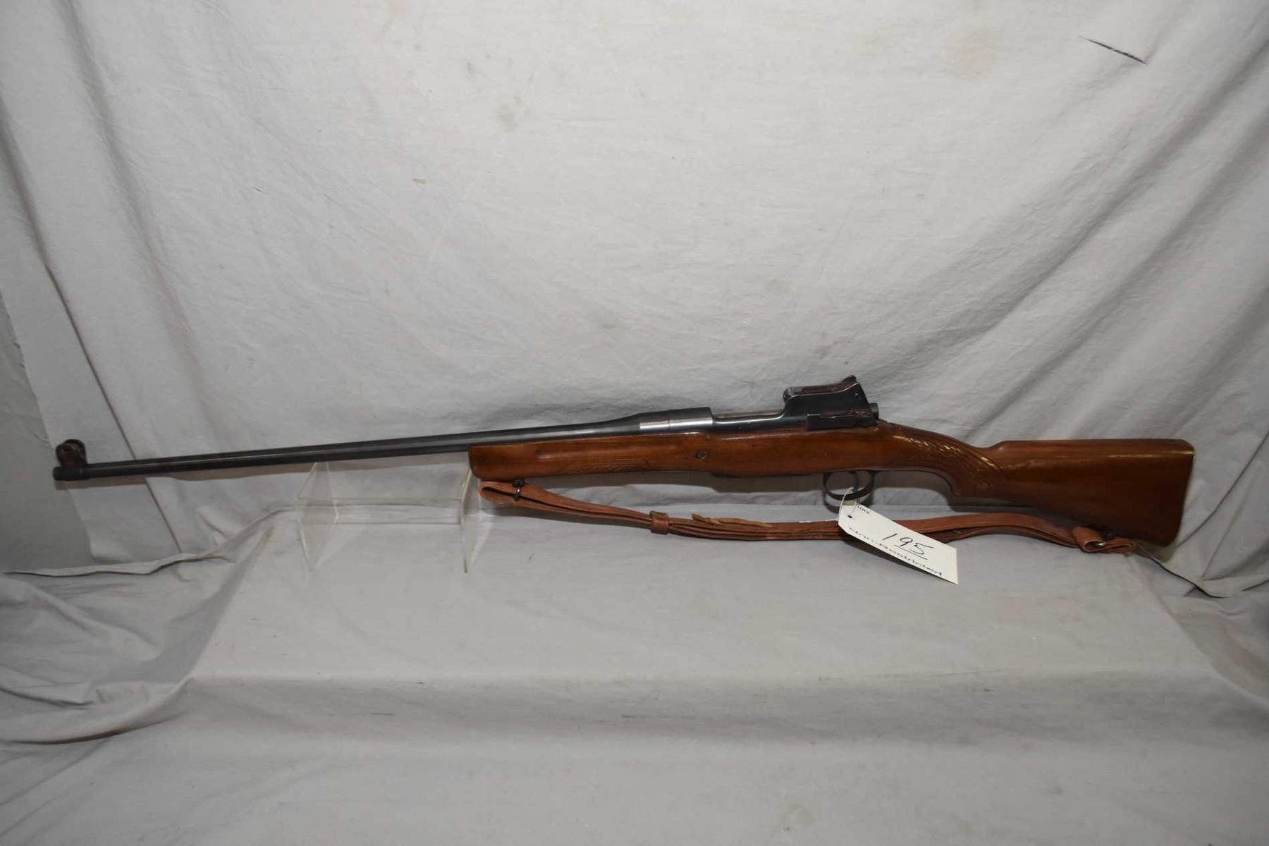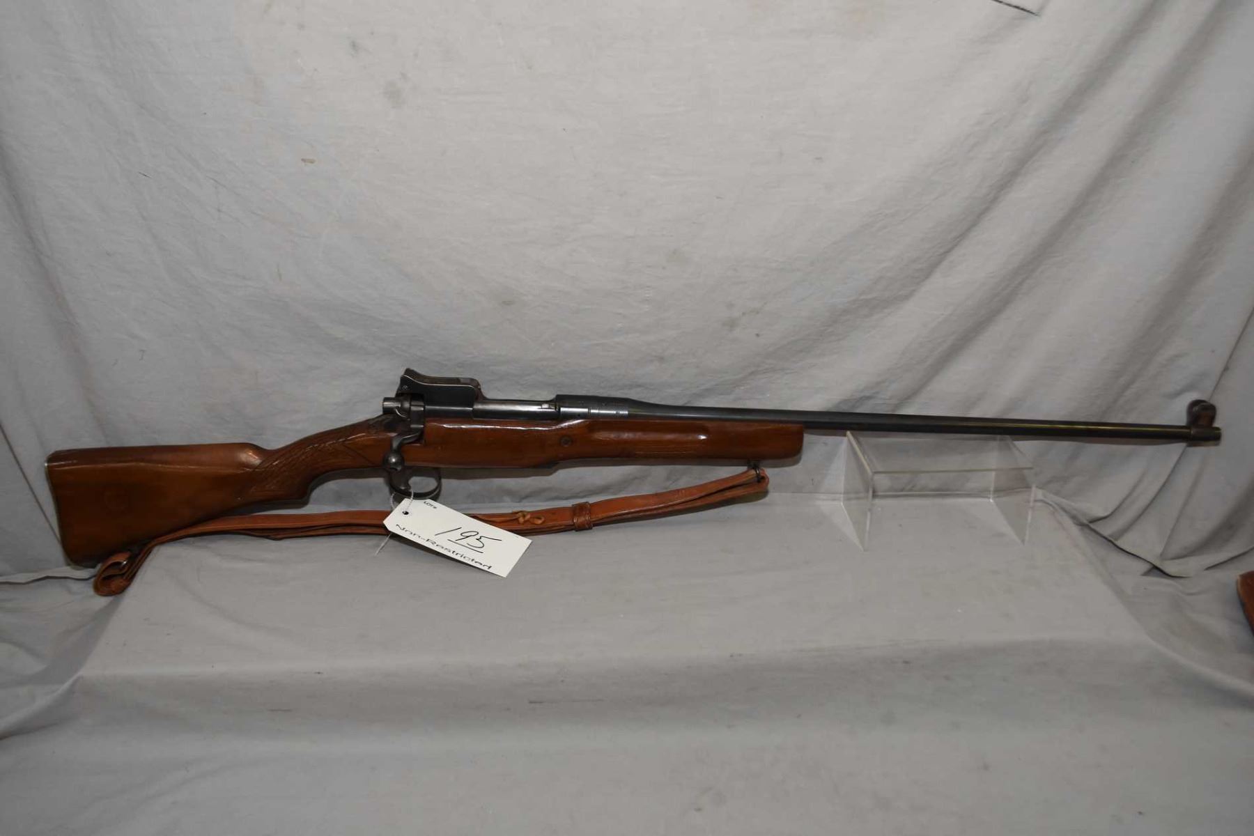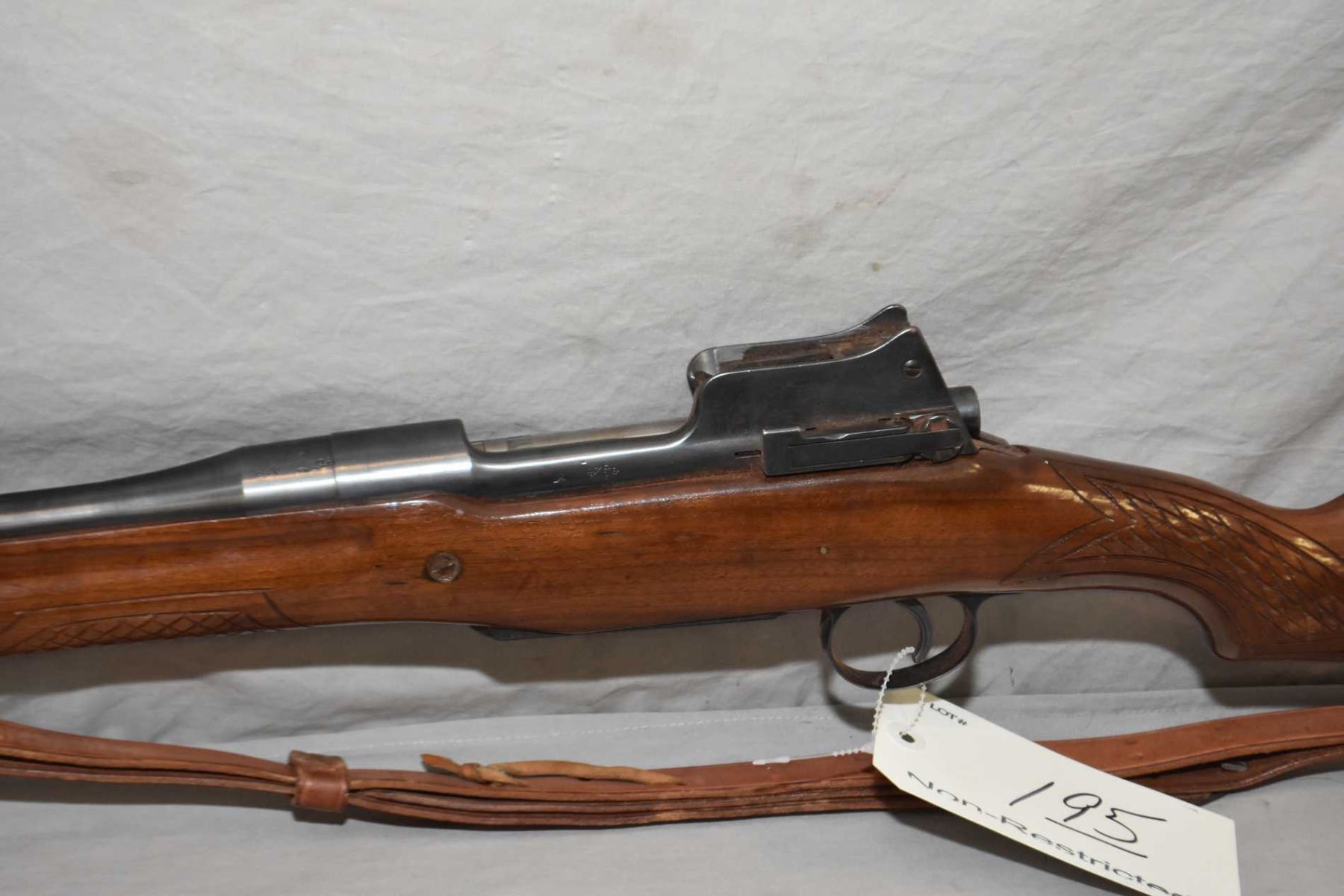 Enfield By Winchester Pattern 1914 .303 Brit Cal Bolt Action Sporterized Rifle w/ 26" bbl [ blued finish, barrel sights, back sight and area needs cleaned, good sporterized wood, with some crude checkering, leather sling with old gun case ] Ser # W89277