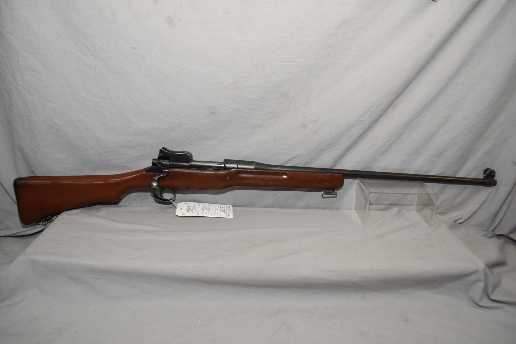 Enfield ( RE ) Model Pattern 1914 .303 Brit Cal Sporterized Bolt Action Rifle w/ 26" bbl [ fading blue finish with some marks and scratches, good sporterized wood with some marks and scratches, wood fillers, and sling swivels,with various marks to metal also ] Ser # 23531