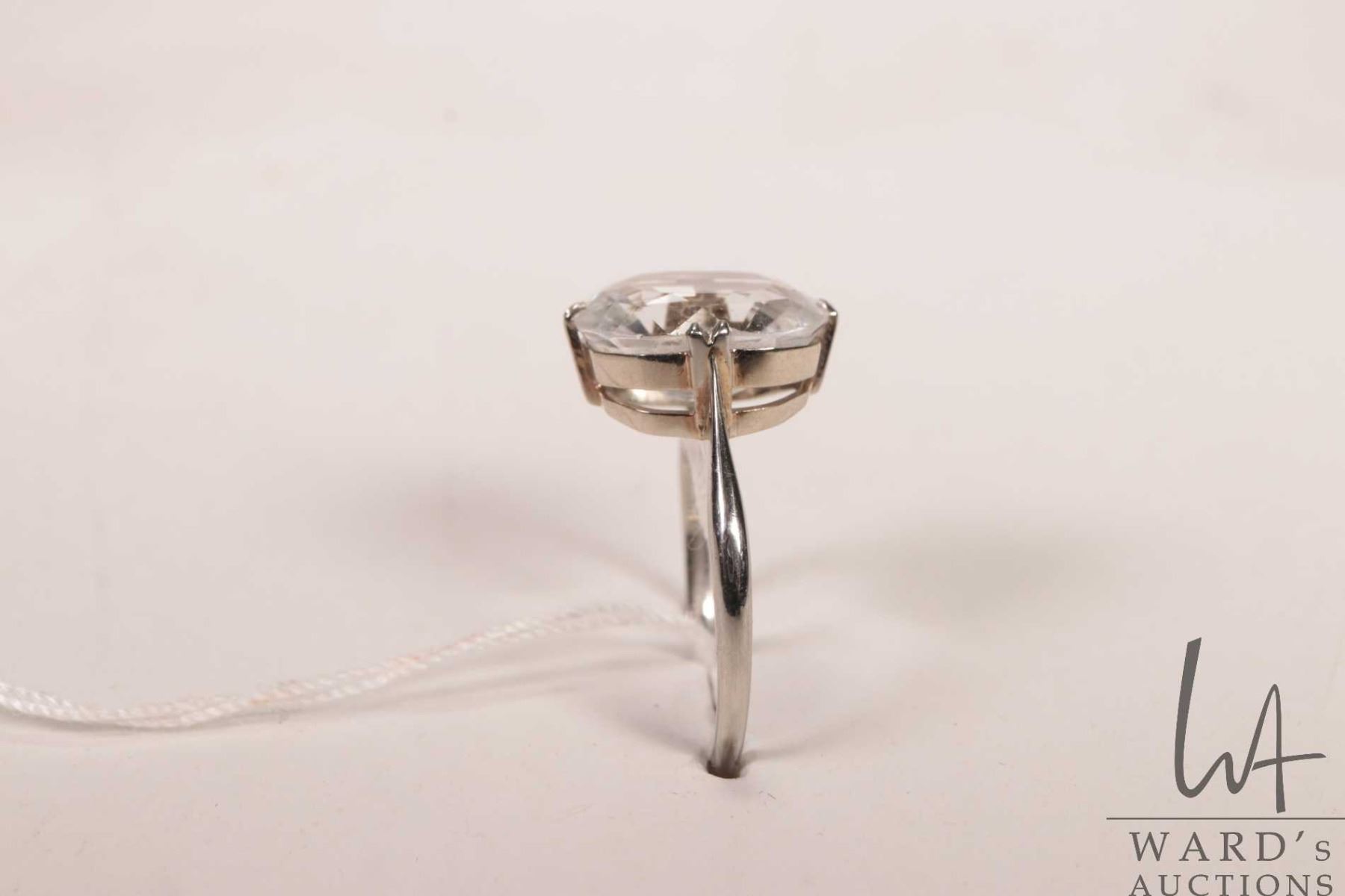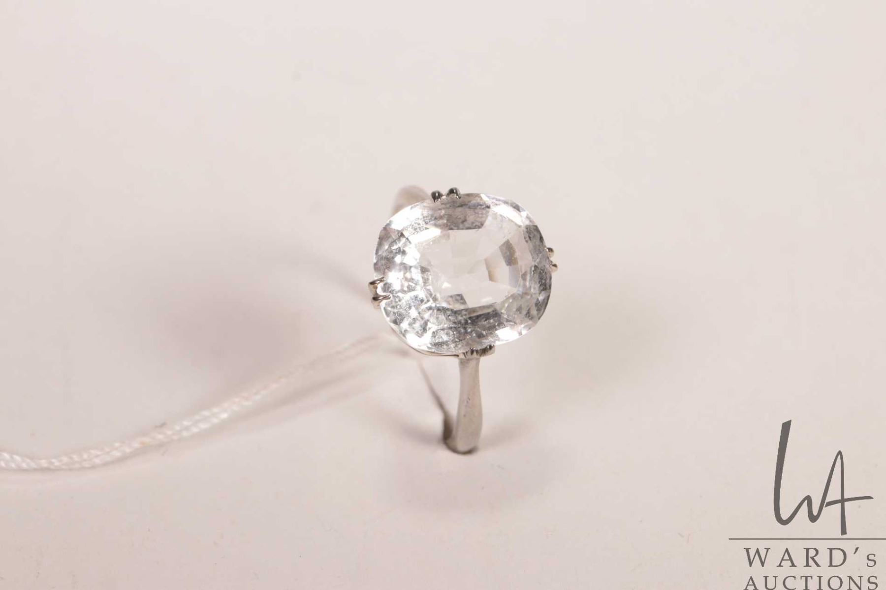 English 9ct white gold ring set with electronically tested white topaz gemstone, size 9