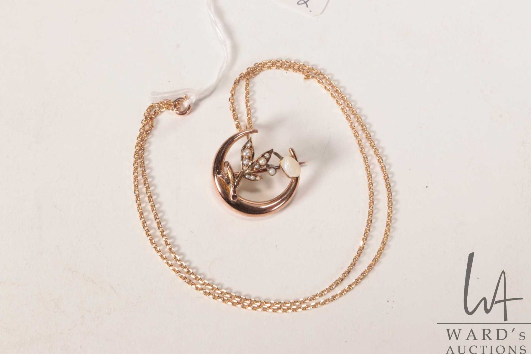 English 9ct yellow gold pendant/ brooch set with seed pearls and fresh water pearl, on 16" 9ct yellow gold neck chain