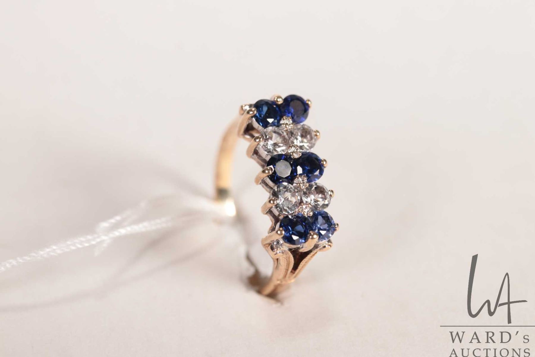 English 9ct yellow gold ring set with electronically tests gemstones, size 7