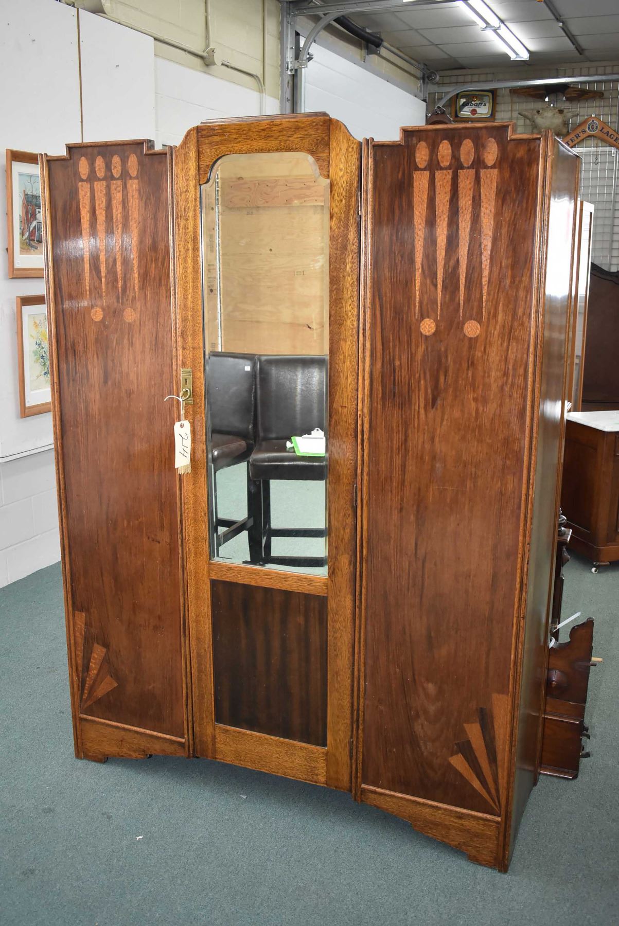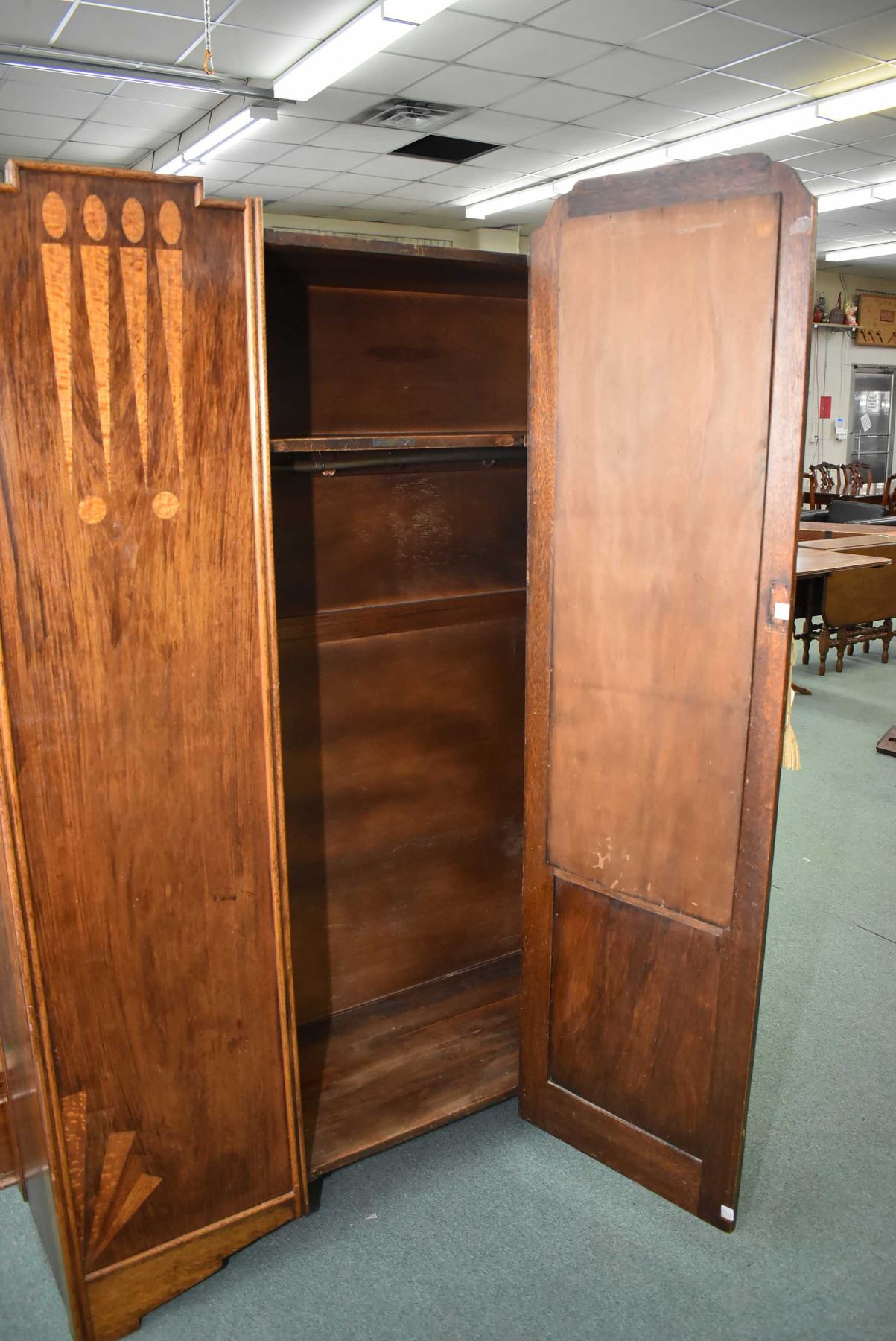 English art deco oak wardrobe with single mirrored door and inlaid oak decoration