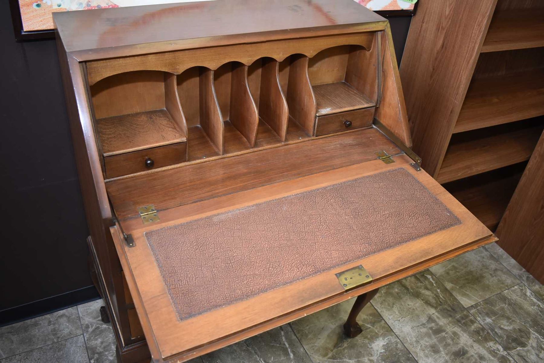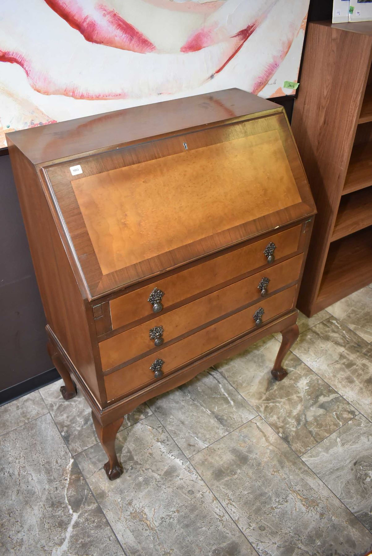 English drop front bureau with fitted interior and leather writing surface, carved ball and claw feet, and bird's eye maple drawer fronts and drop panel