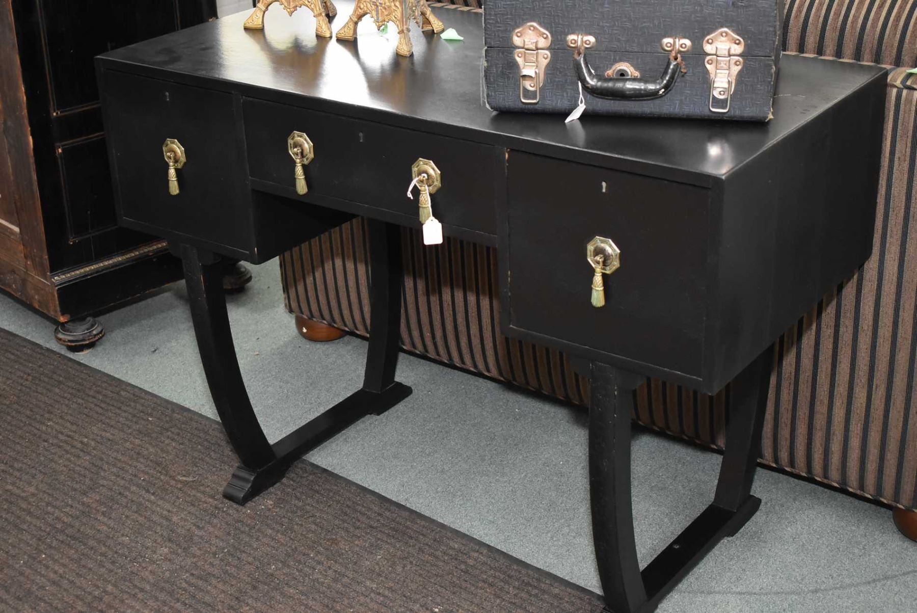 English oak three drawer Art deco writing desk with original tassel motif pulls