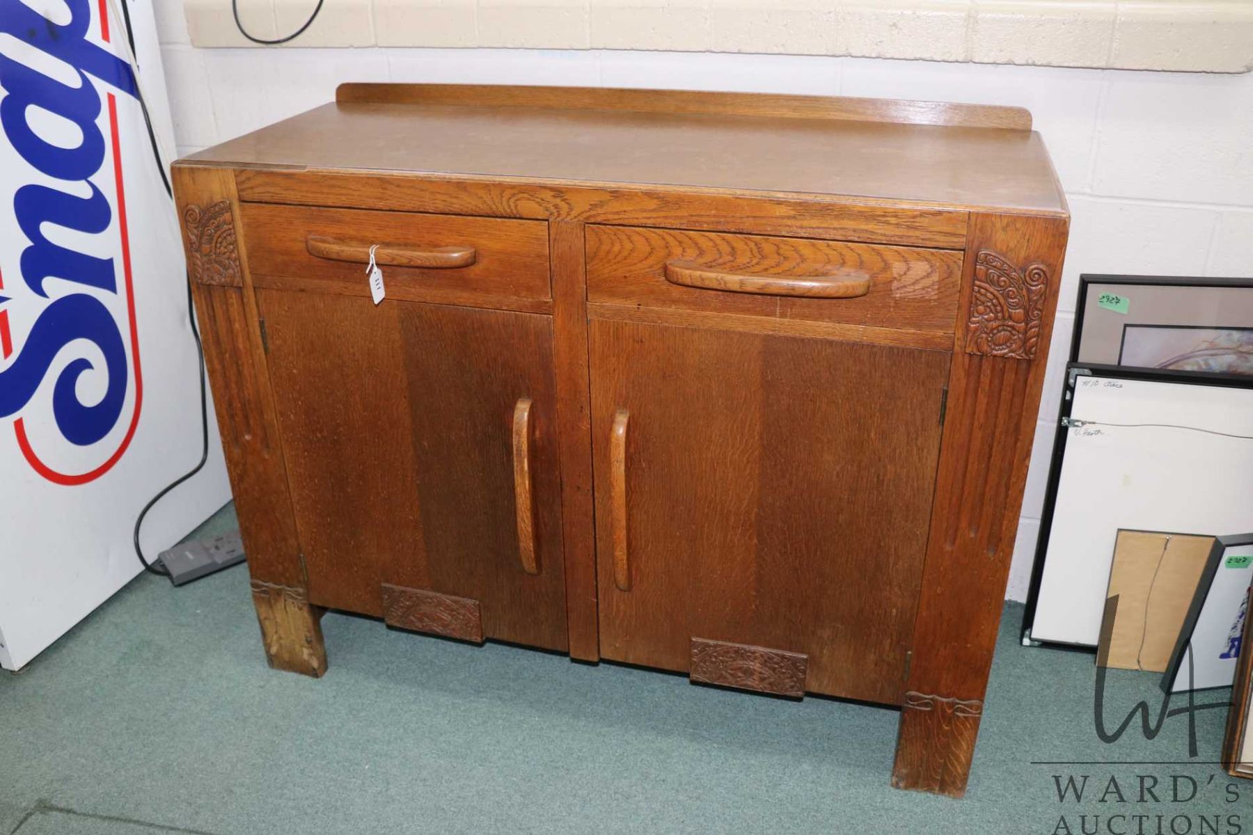 English oak two door, two drawer sideboard with carved decoration, 37" H X 48" W X 21" D